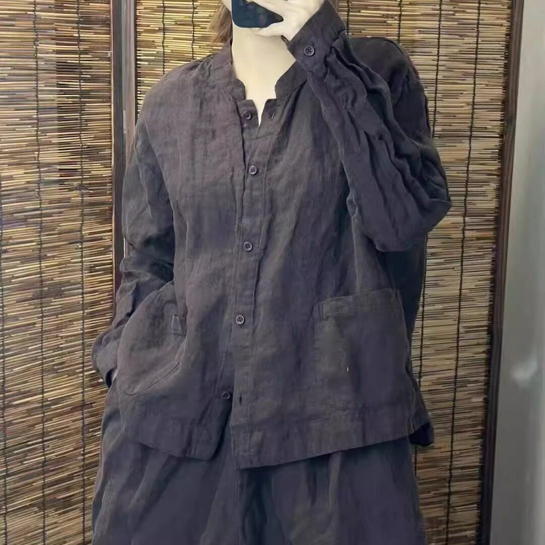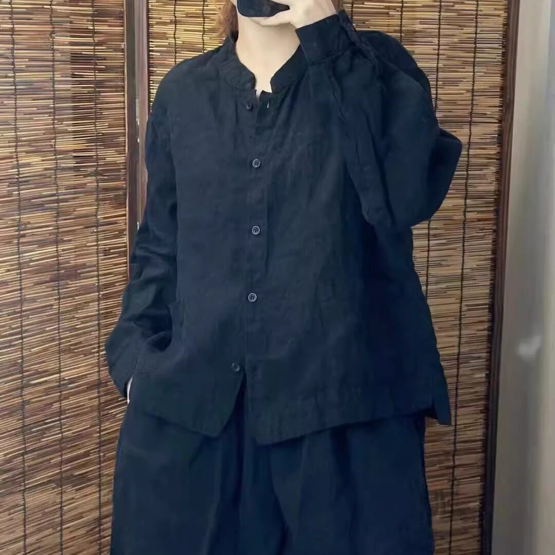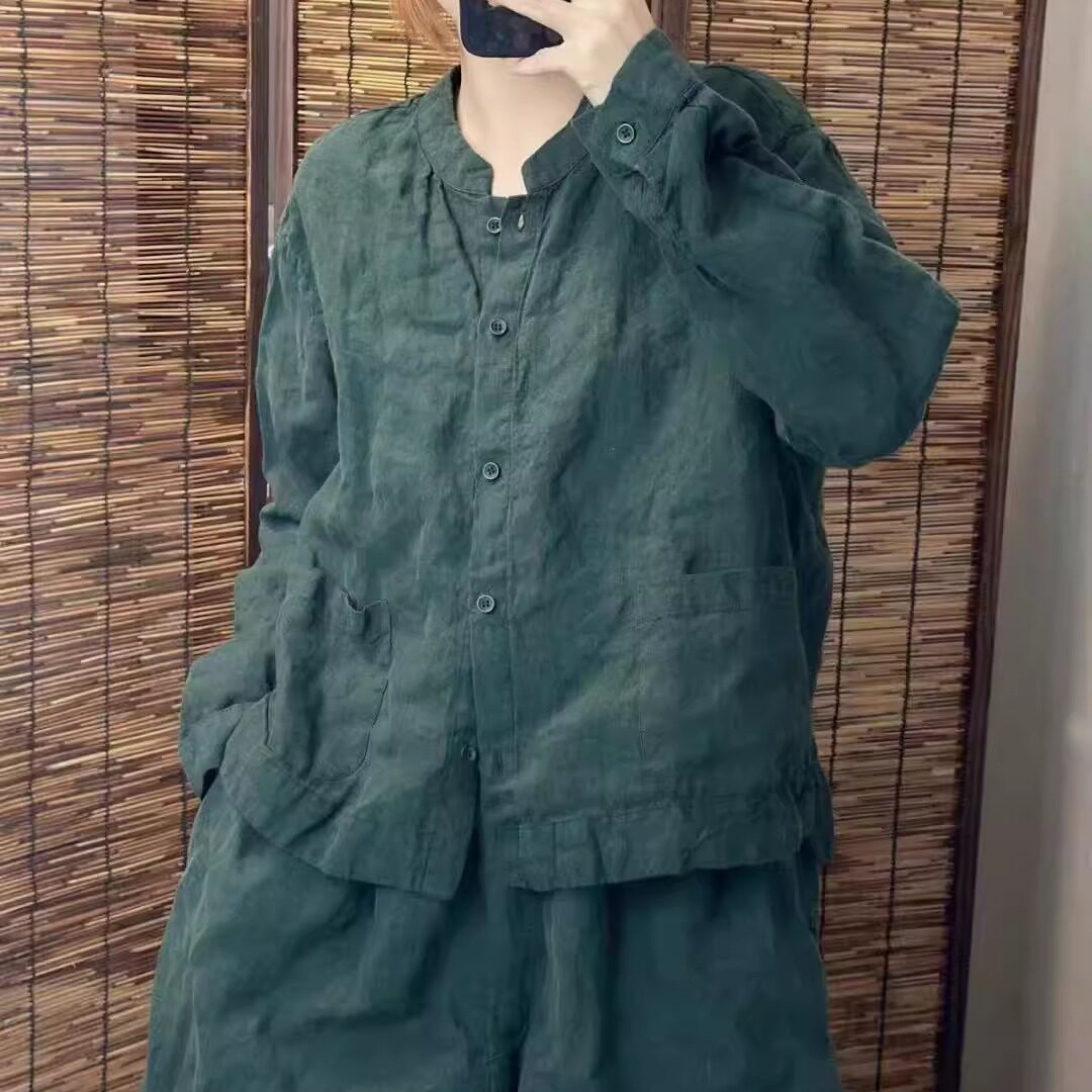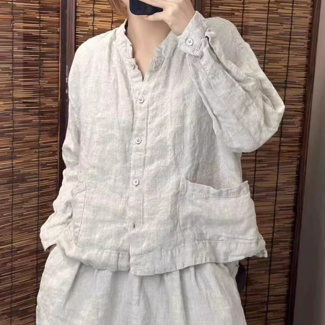 📚 9383-秋季款新款长袖女士小V领纯色亚麻衬衫女休闲文艺范亚麻上衣
