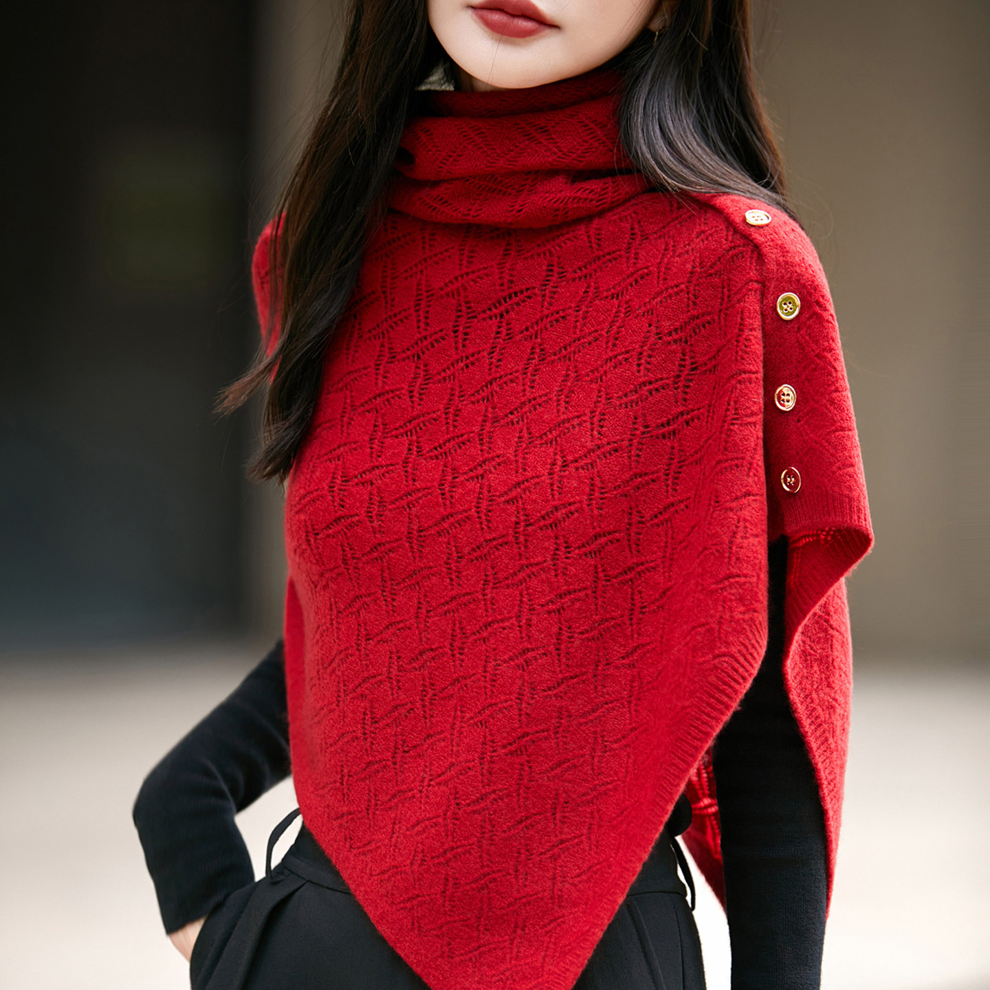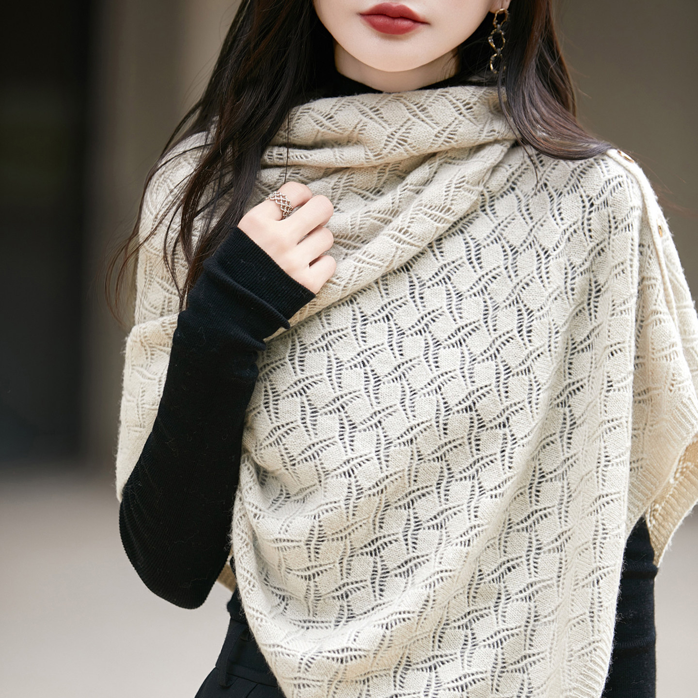 📚 春秋新款100%羊毛披肩女外搭斗篷针织三角上衣镂空薄钩花围脖围巾