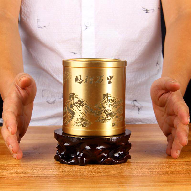 📚 大号铜实心笔筒摆件配木底座办公桌摆件铜笔筒摆件