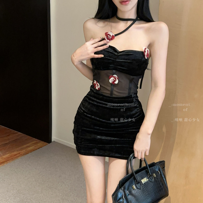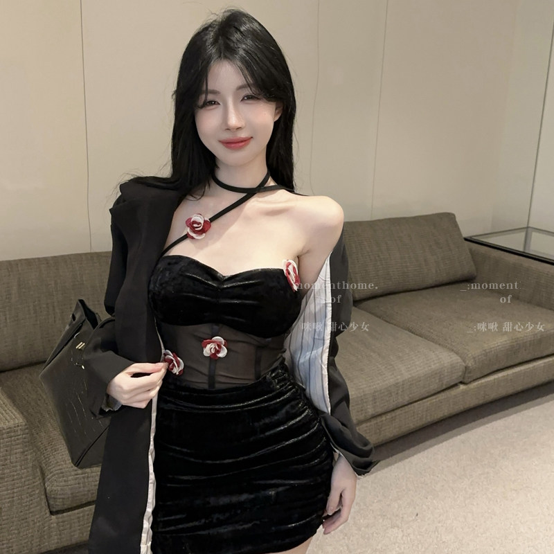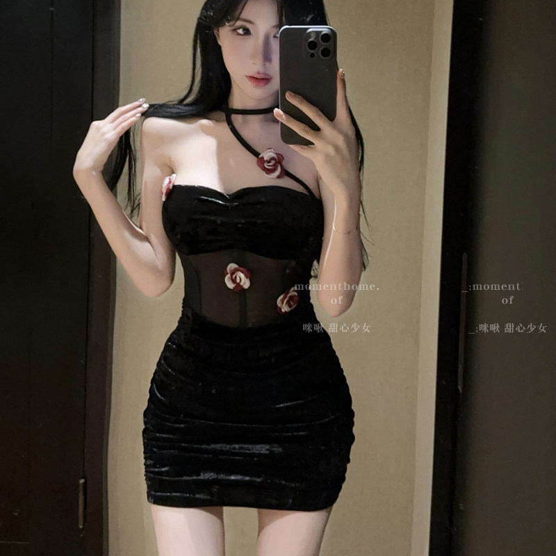 📚 纯欲性感甜辣妹花朵抹胸挂脖连衣裙夜店酒吧修身显瘦丝绒包臀裙子