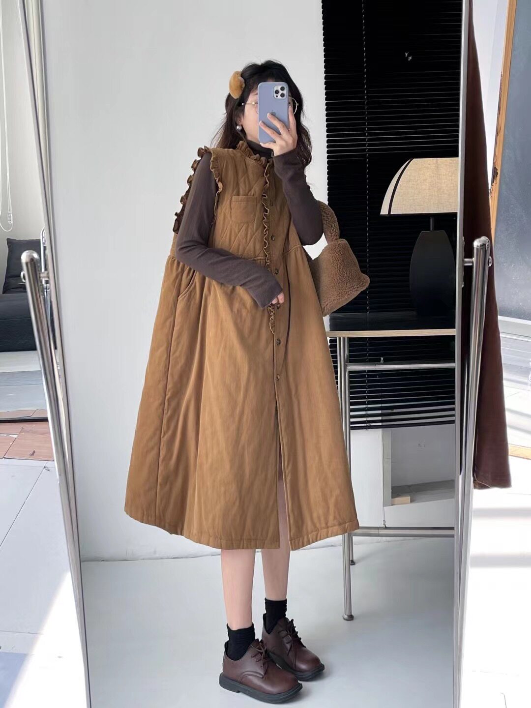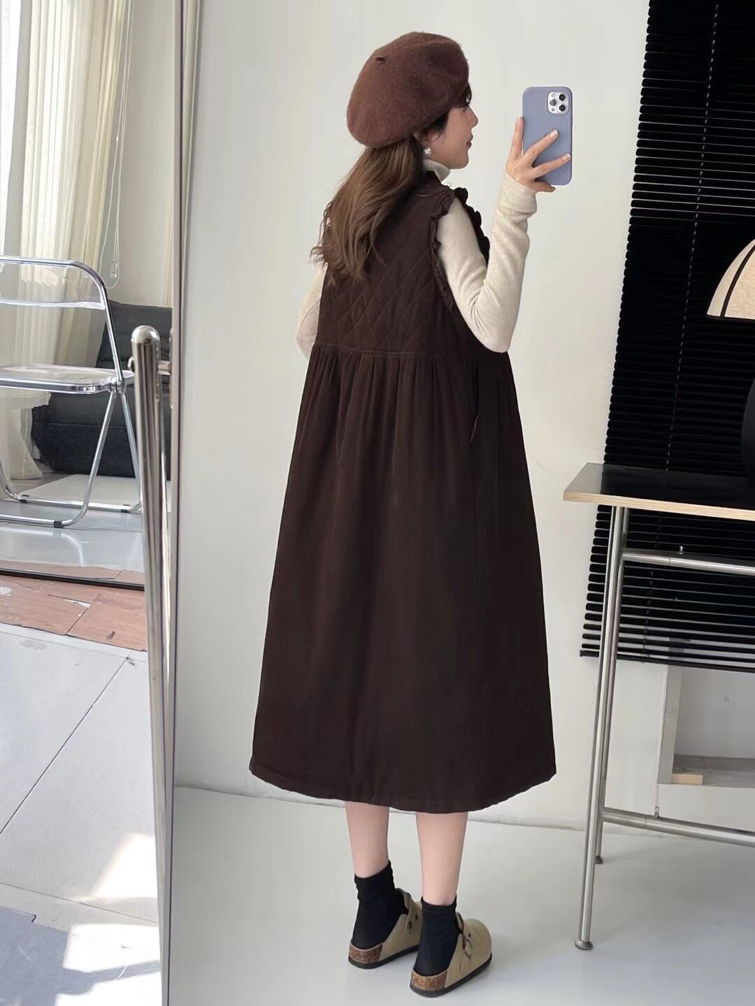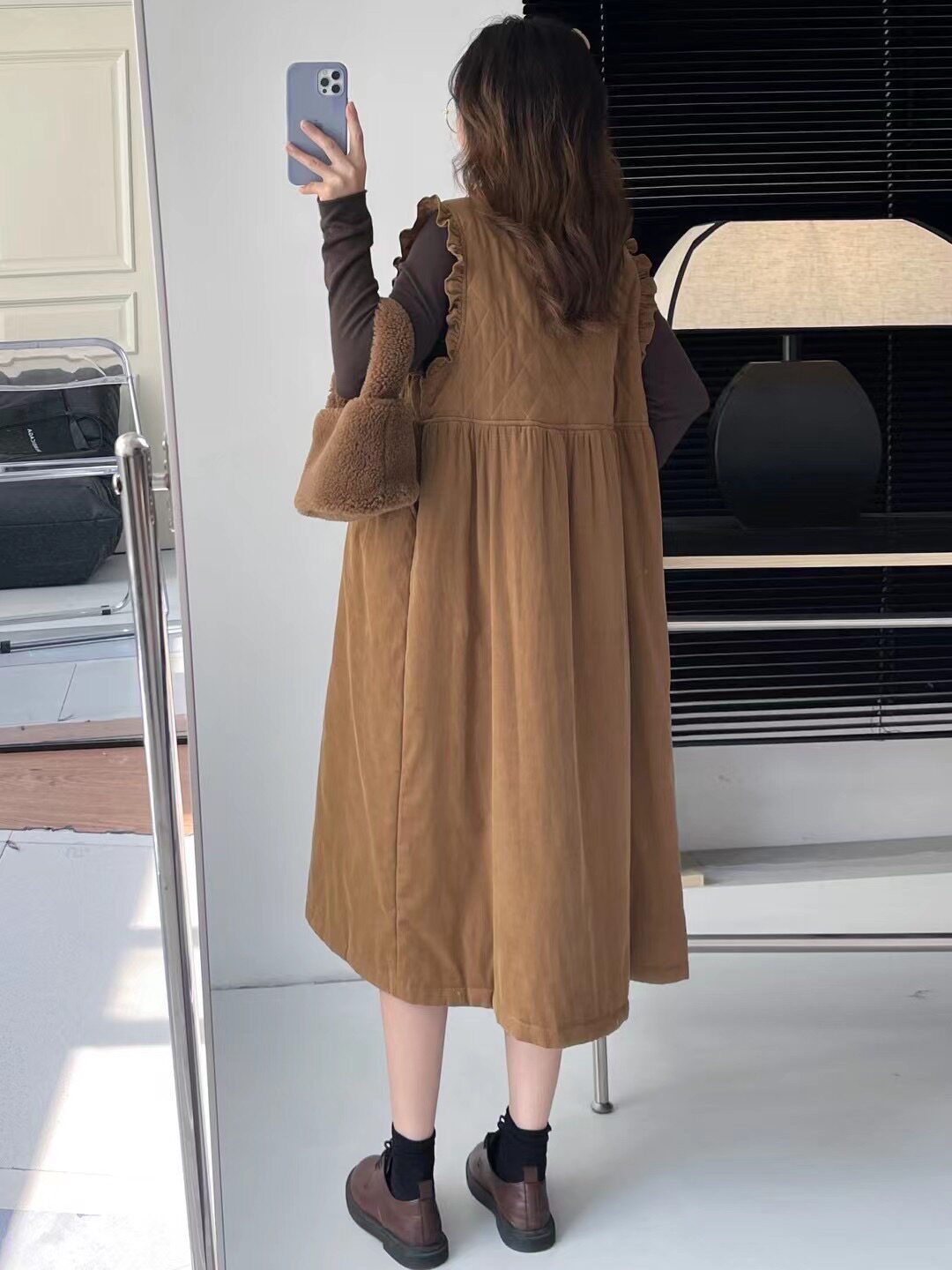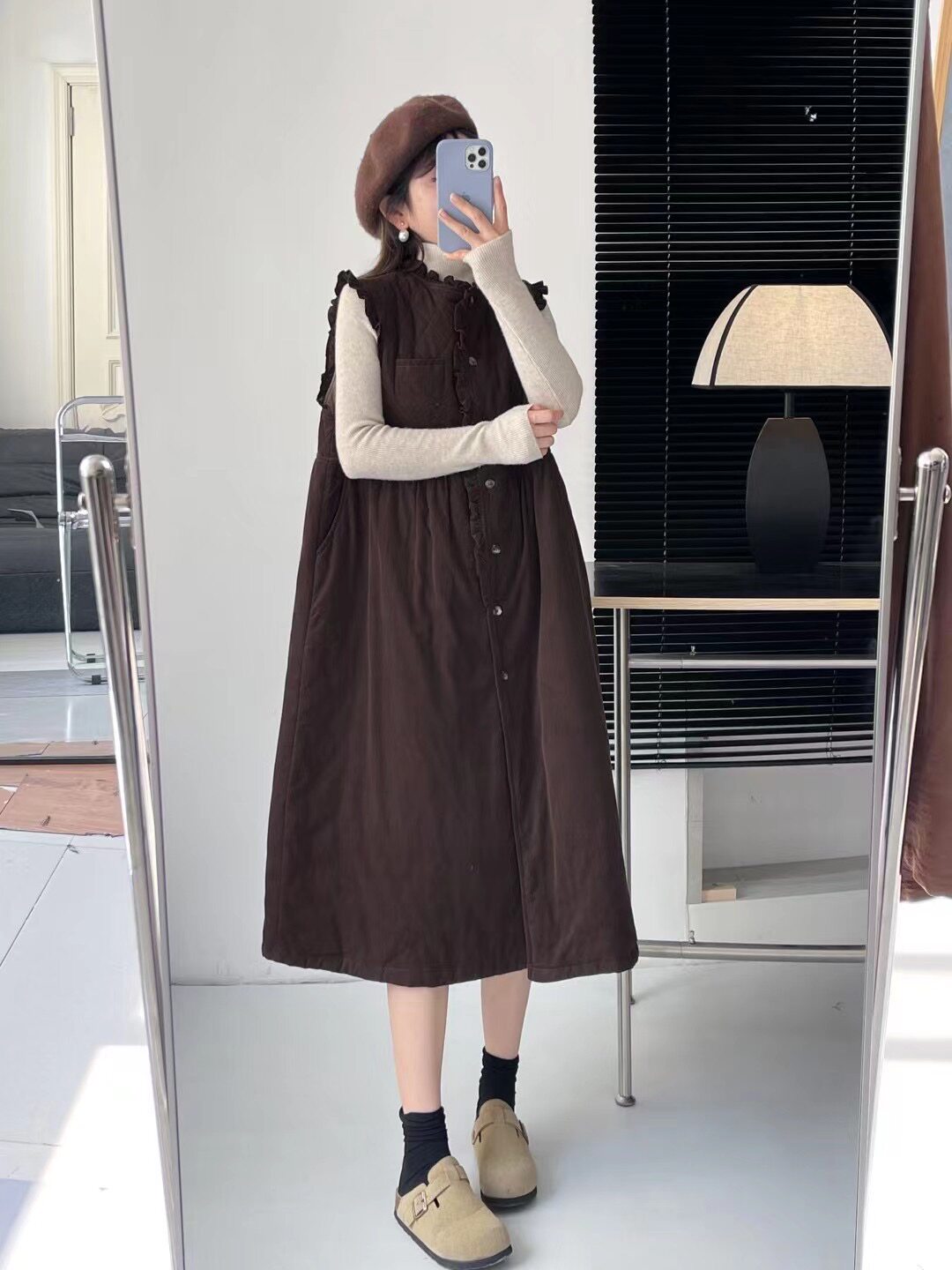 📚 森系乖乖女木耳花边拼接加棉前开扣背心裙甜美减龄长款马甲连衣裙