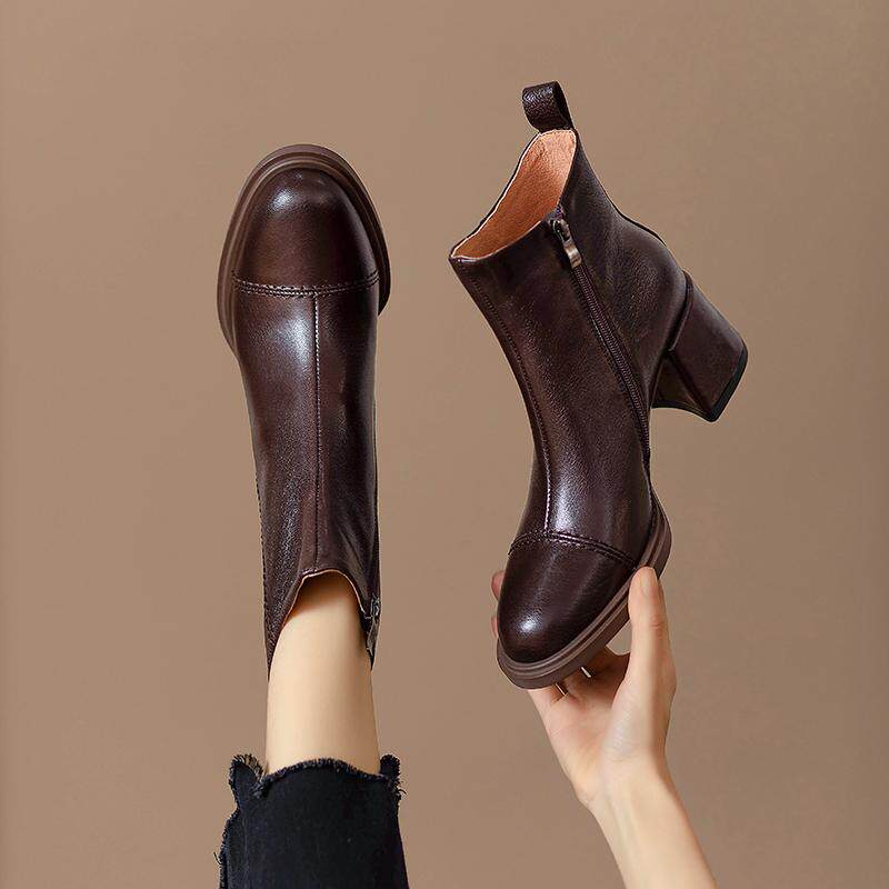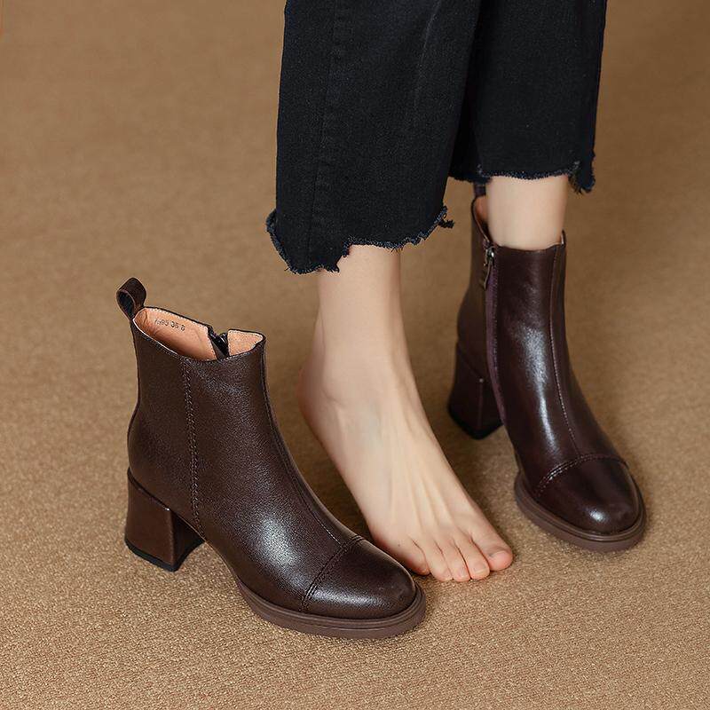 📚 棕色小羊皮短靴女2026新款秋冬中跟裸靴超软踝靴粗跟高跟女靴厚底