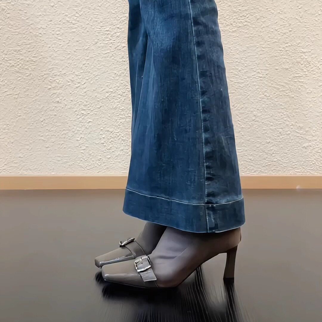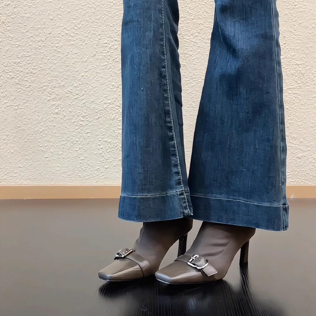📚 RubyL/7cm小个子高跟女靴法式气质方头皮带扣显瘦弹力瘦瘦靴短靴