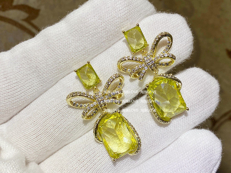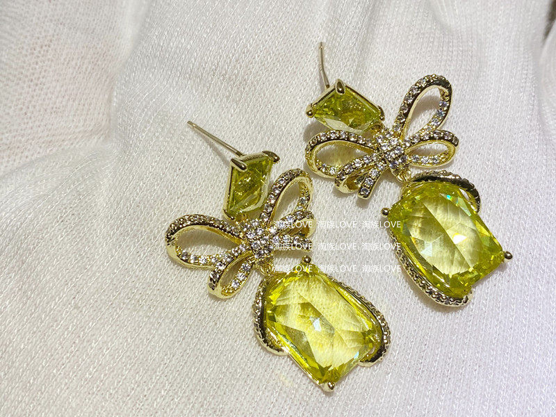 📚 法式优雅浪漫高级感个性立体蝴蝶结高透黄绿镶钻耳钉耳环银针
