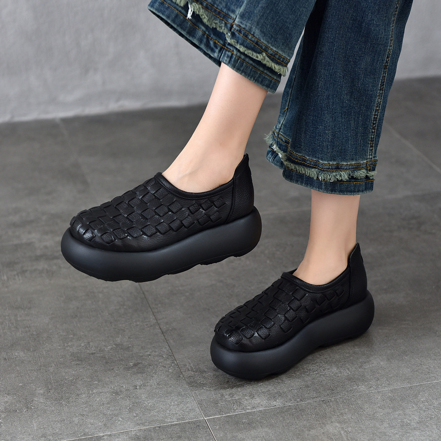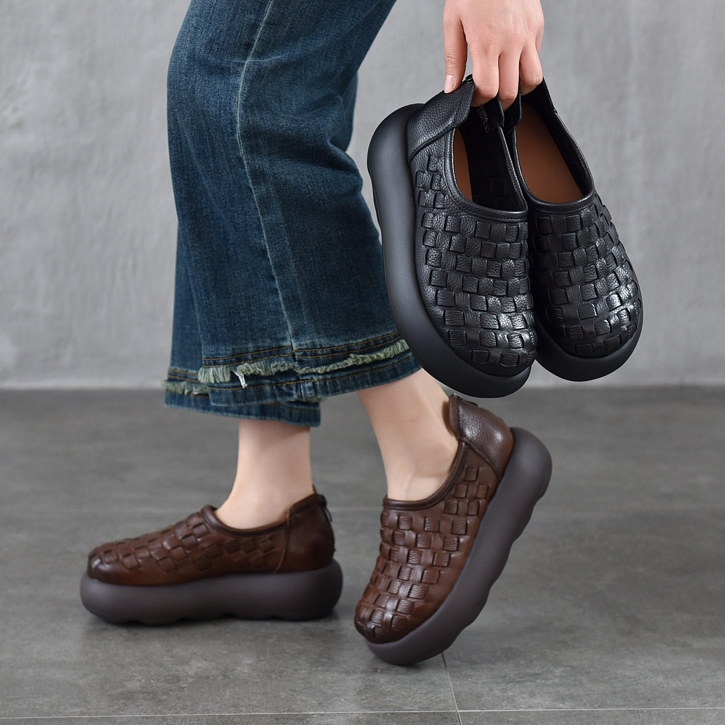 📚 头层牛皮乐福鞋女2026新款春款圆头真皮女鞋复古手工编织厚底单鞋