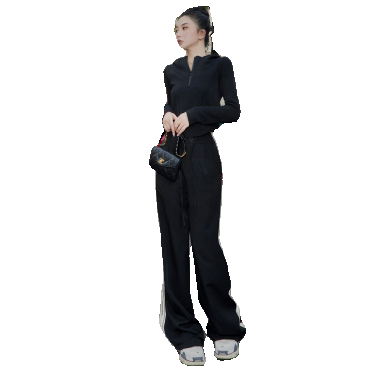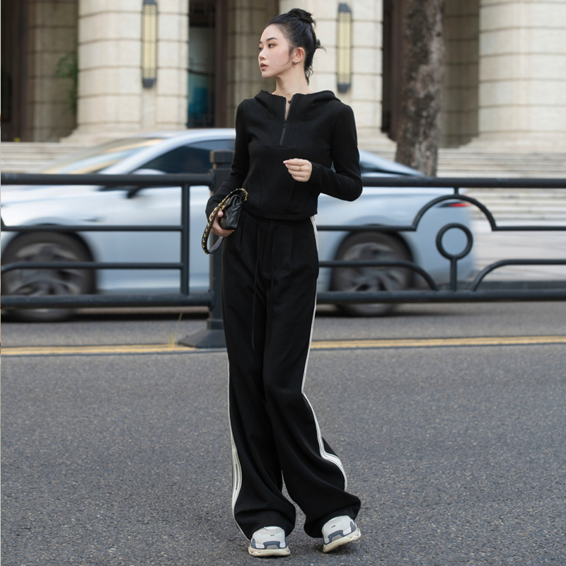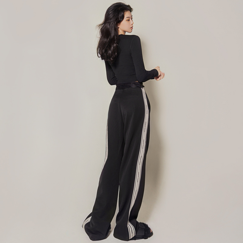 📚 月影集 侧条纹黑色阔腿裤女高腰垂感秋冬加厚直筒拖地运动休闲裤