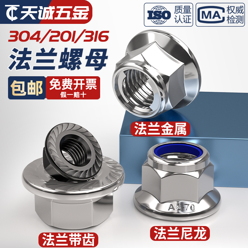📚 304/316/201不锈钢六角法兰螺母螺帽带齿带垫防松防滑螺丝帽M3-16