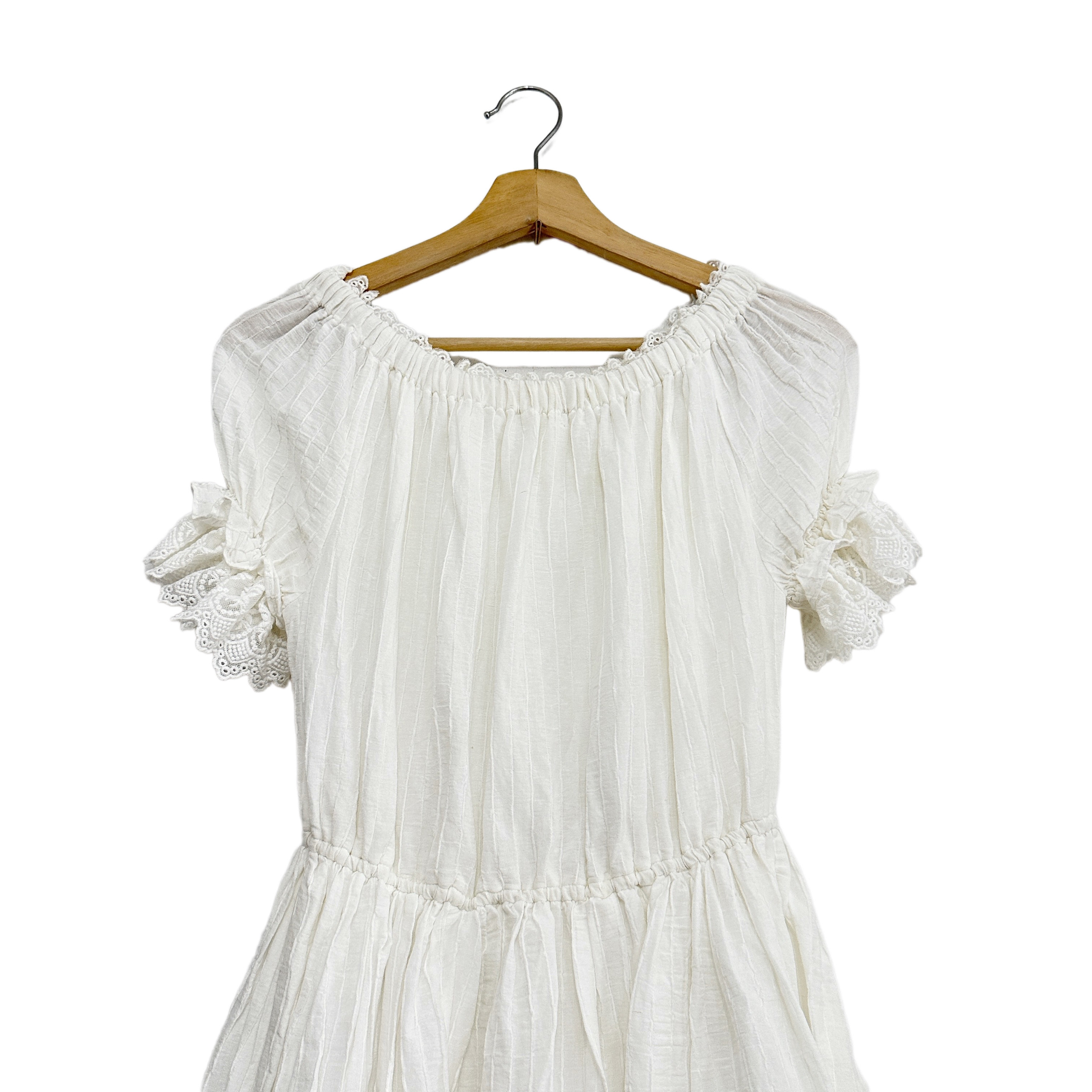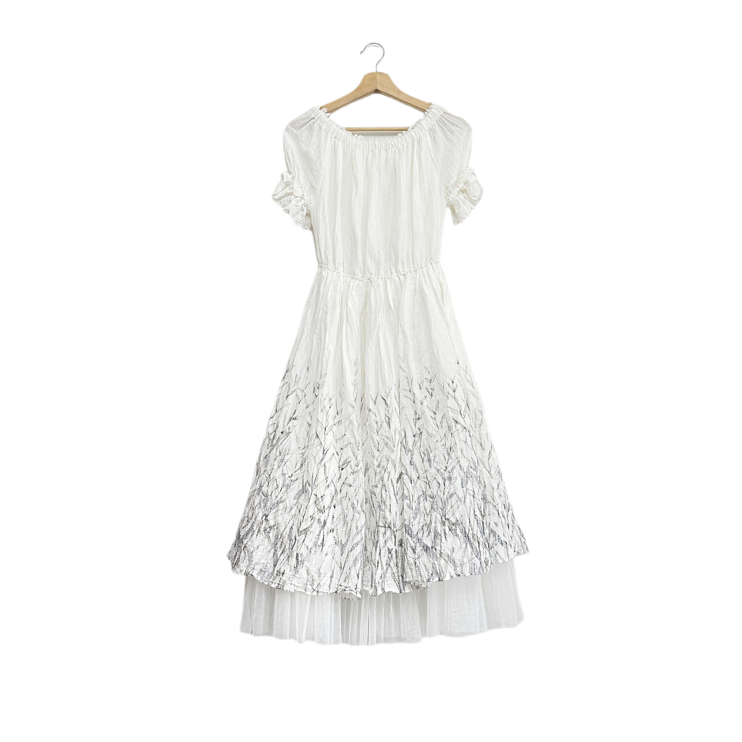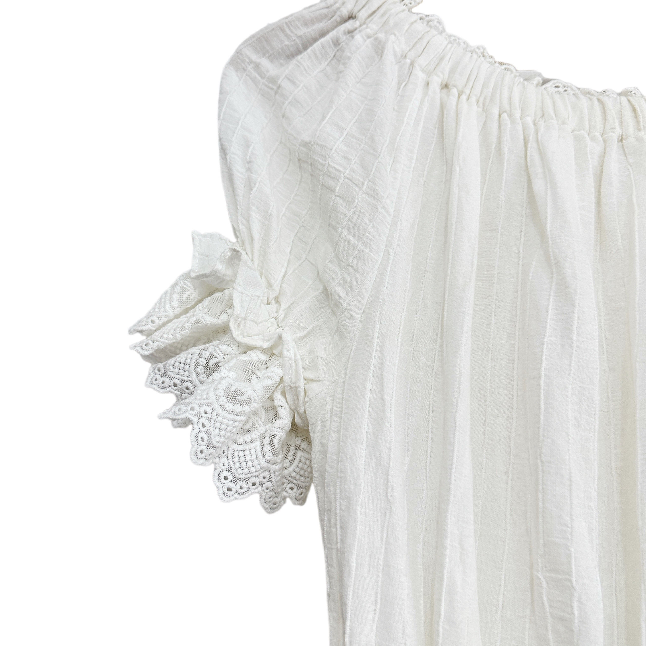 📚 圣迪折扣女装 优雅蕾丝花边网纱拼接松紧腰一字肩棉麻连衣裙