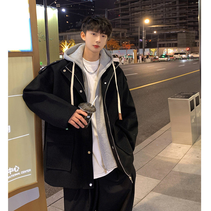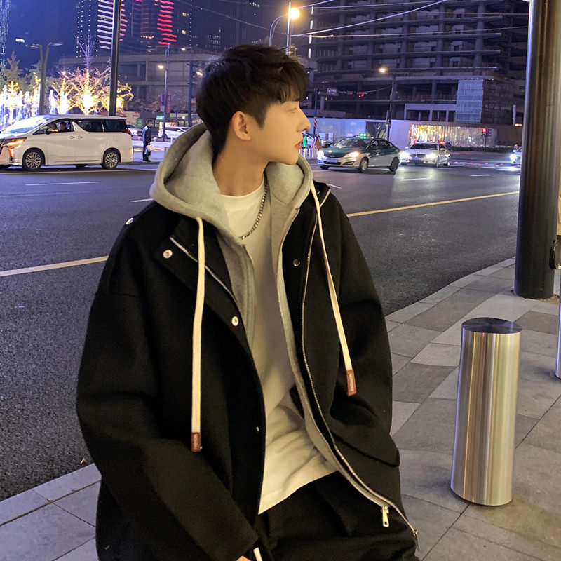 📚 假两件外套男冬季潮牌宽松百搭情侣连帽风衣美式港风中长款呢大衣