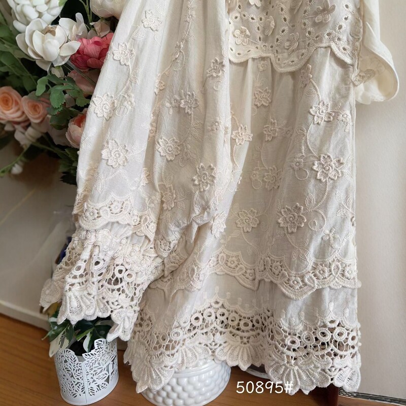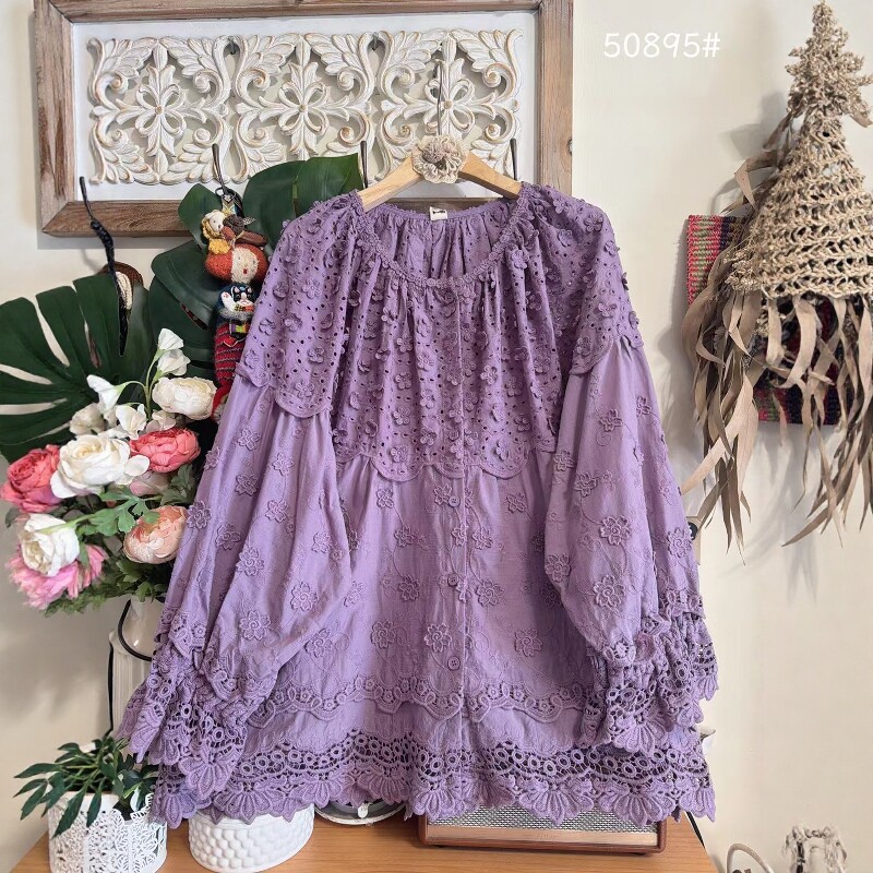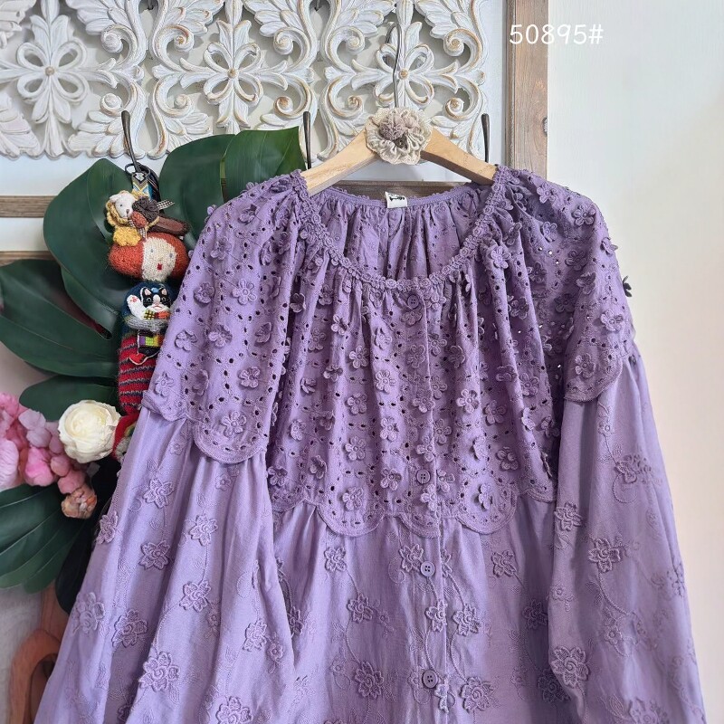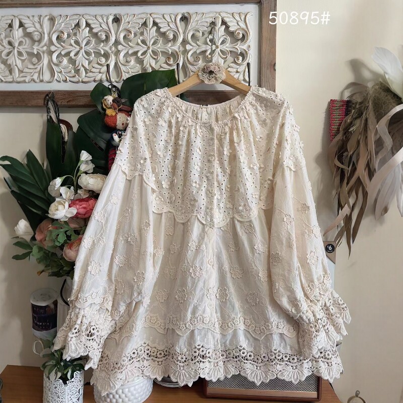 📚 森系蕾丝圆领立体花朵刺绣镂空拼接衬衫宽松甜美百搭减龄长袖开衫