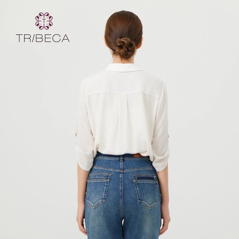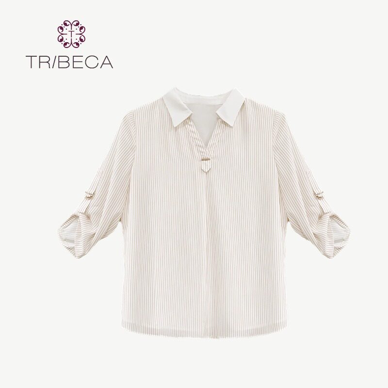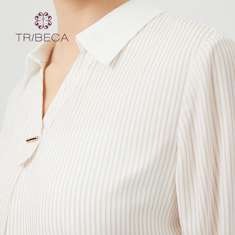 📚 TRIBECA/翠贝卡春季新款商场同款休闲百搭翻领女七分袖条纹衬衫