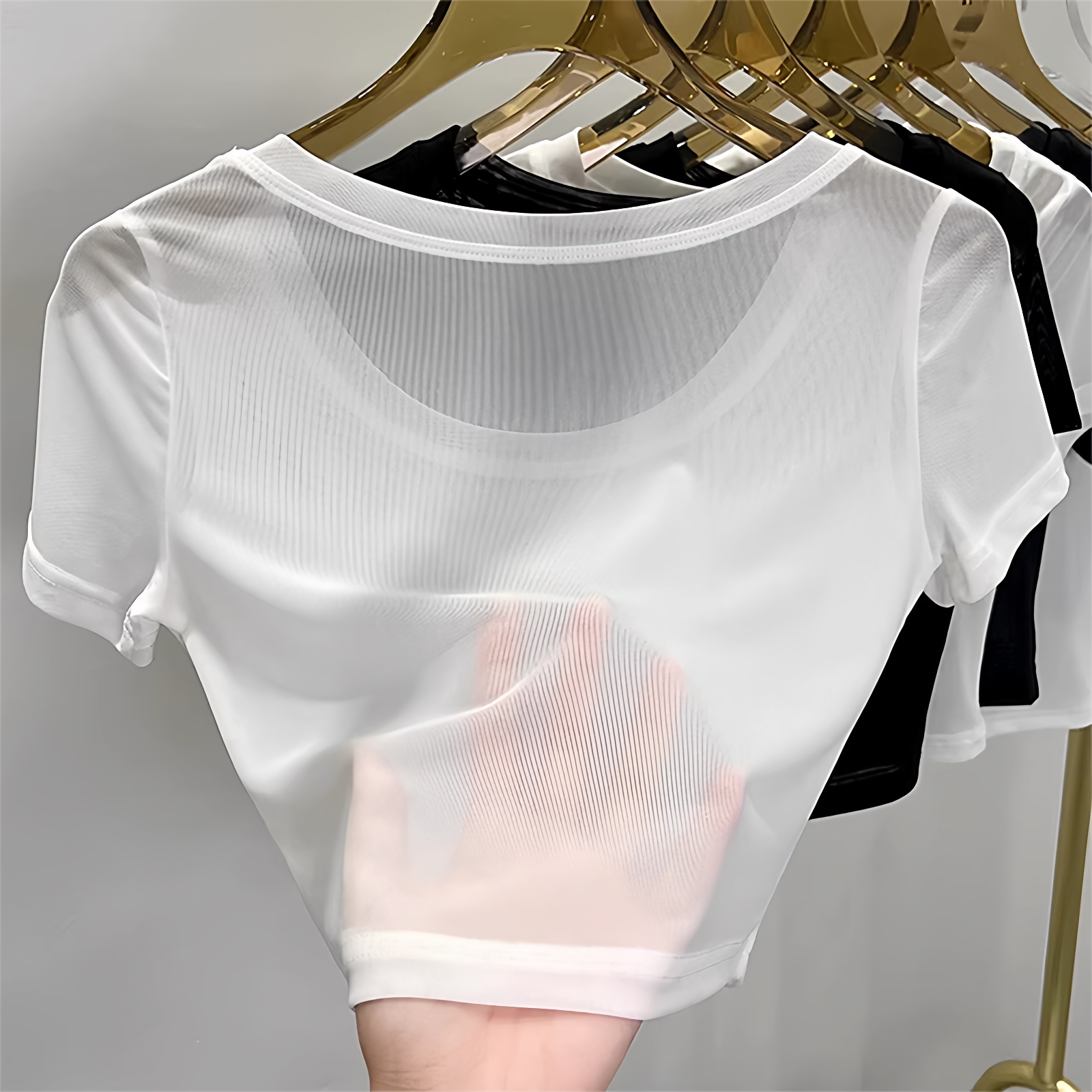 📚 白色冰丝网纱短袖T恤女2025新款夏季薄款吊带裙内搭短款薄纱上衣