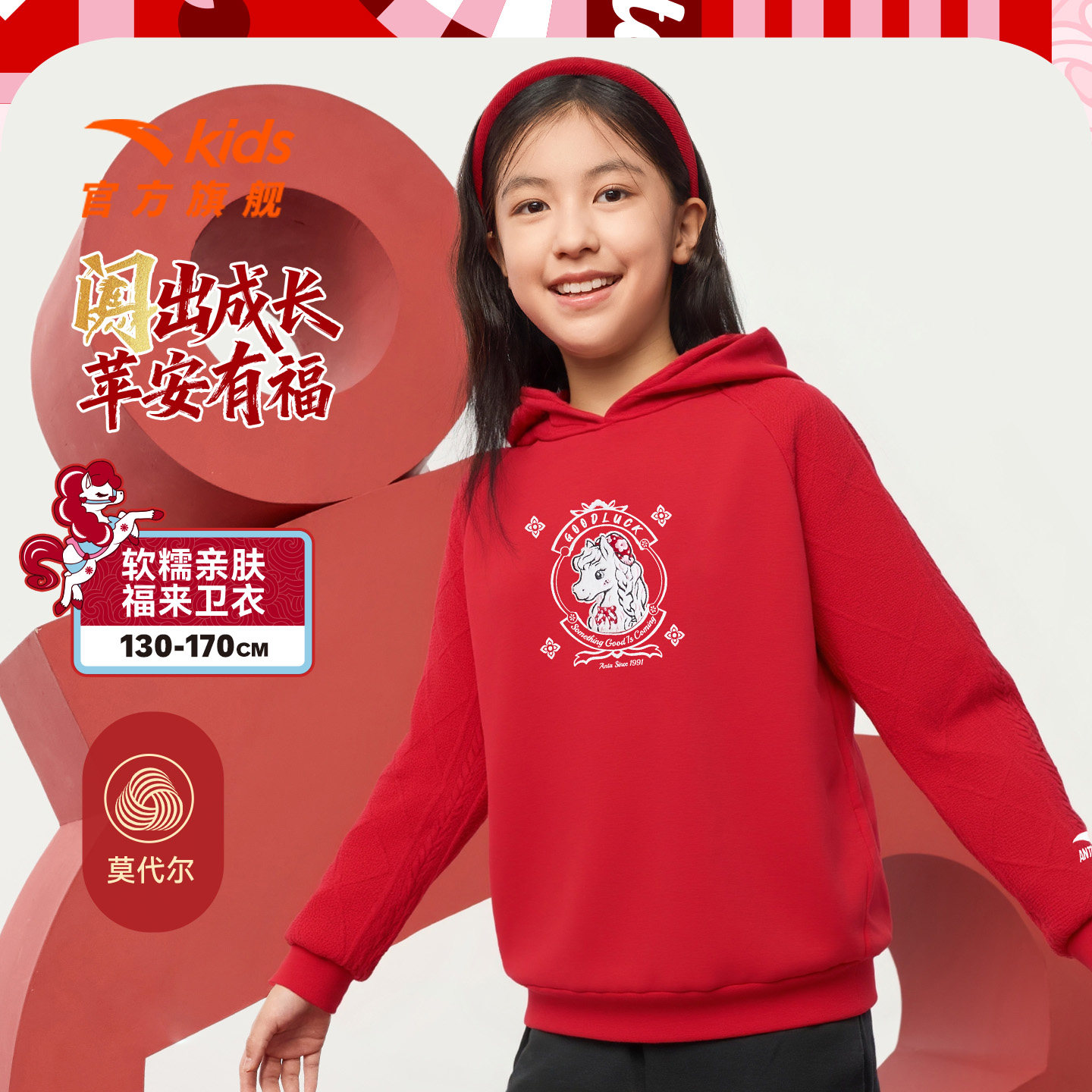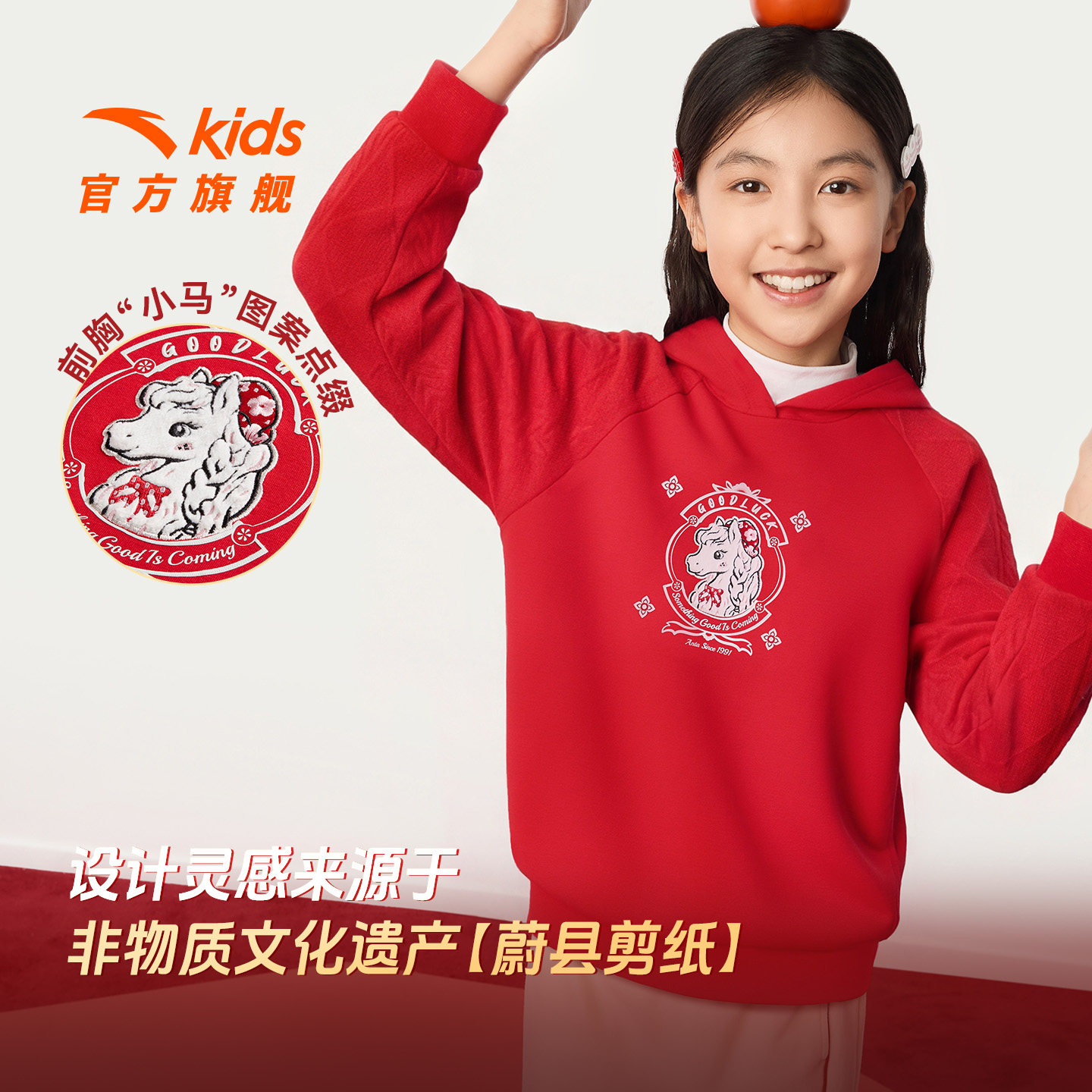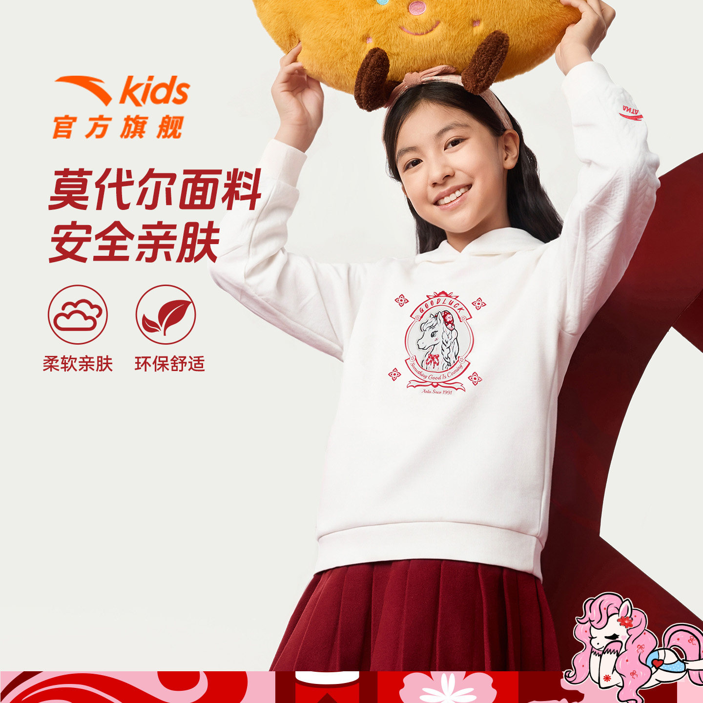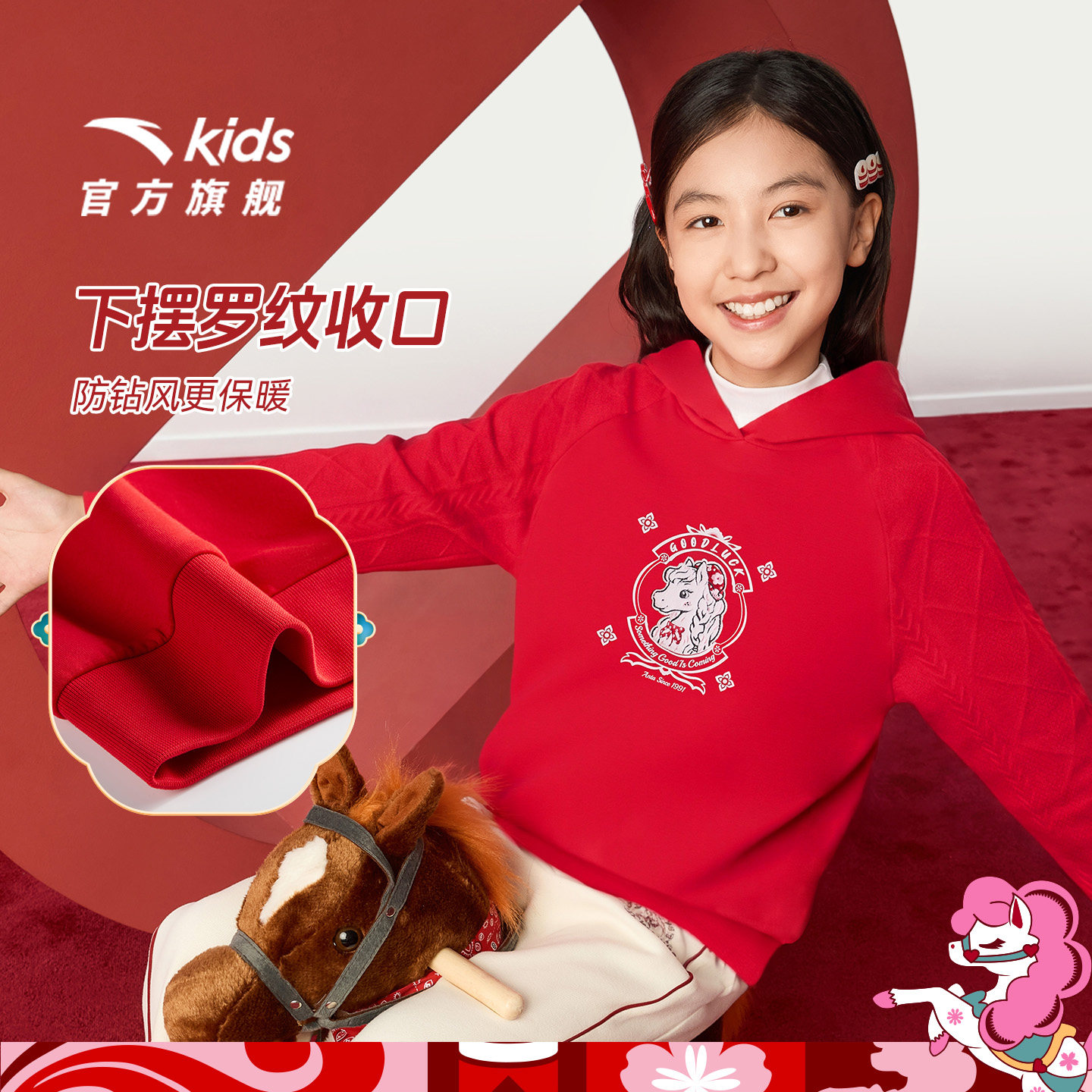 📚 新年款安踏儿童女大童针织连帽套头衫2026年新款舒适女孩潮流卫衣