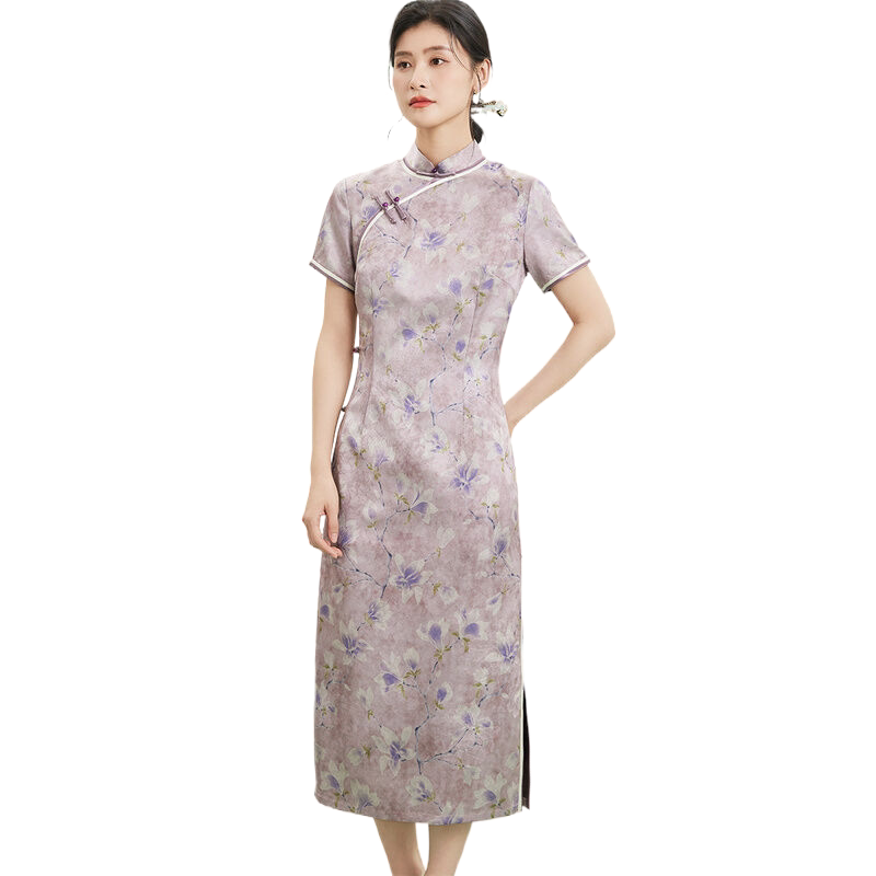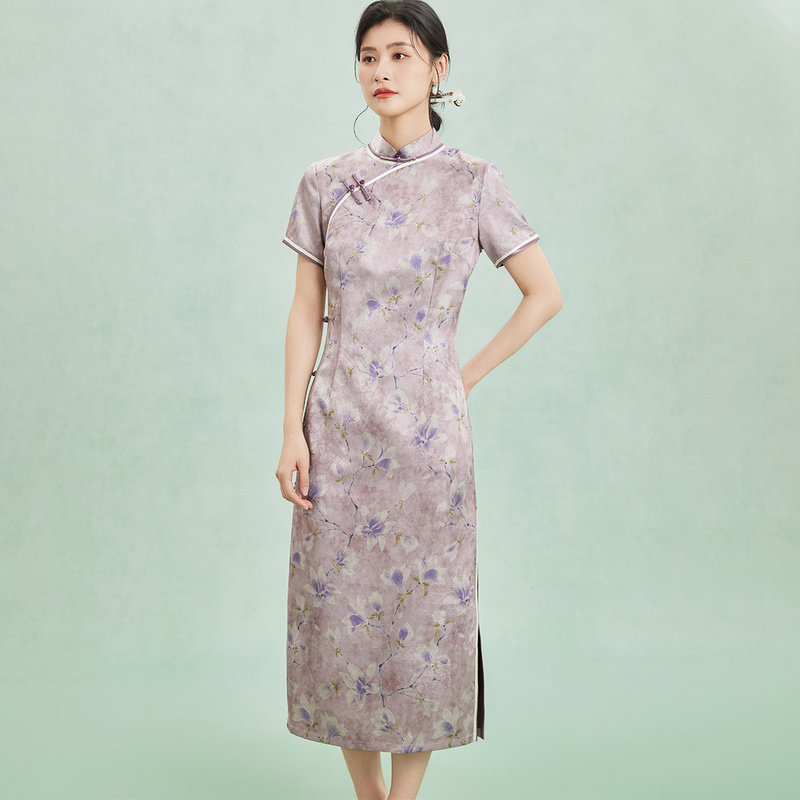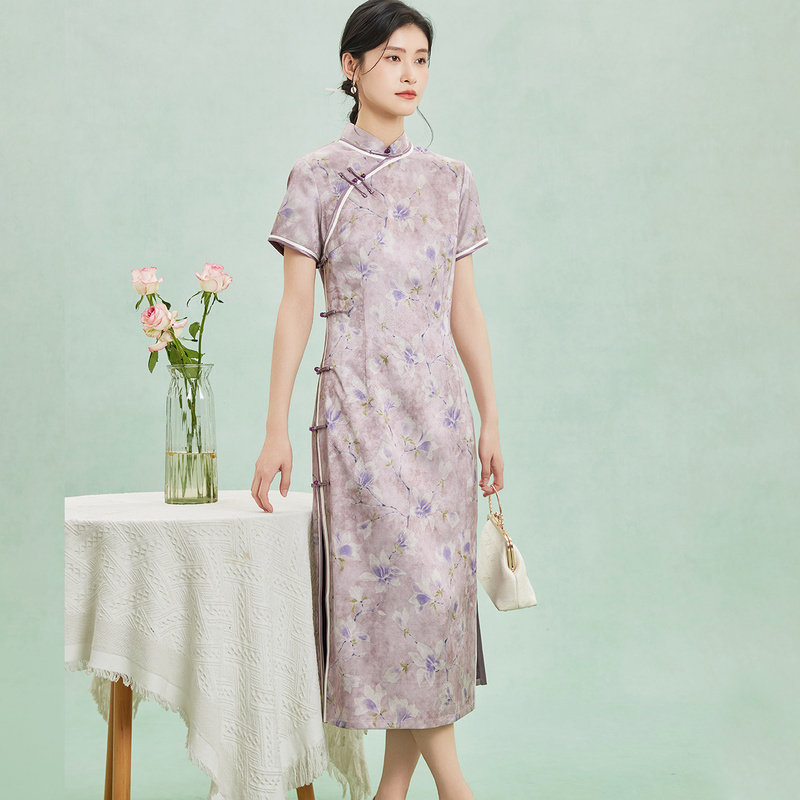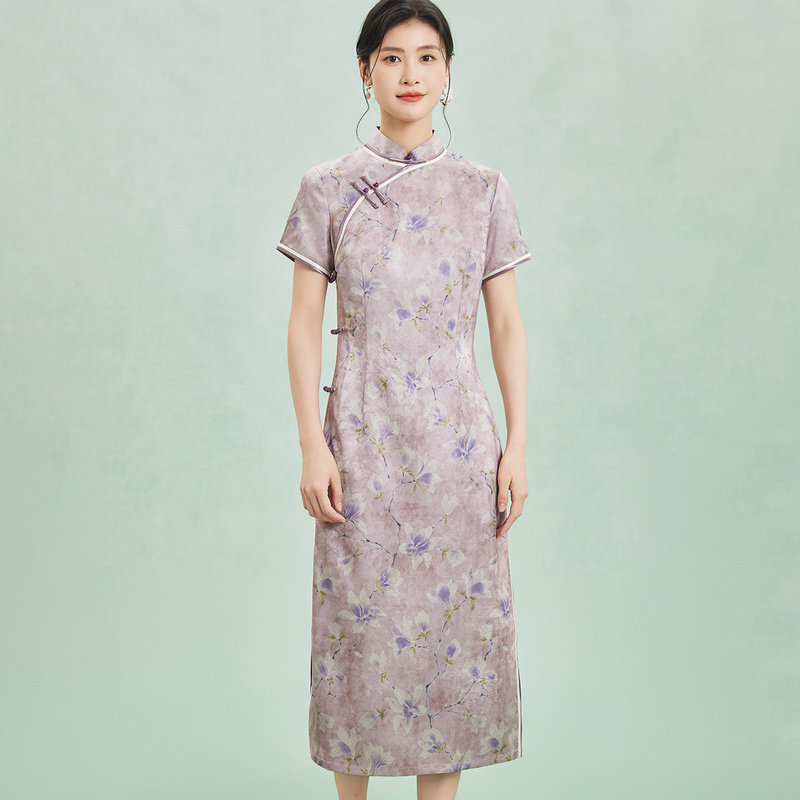 📚 母亲节【婉约旗袍】玉兰花26年立领撞色织条女式连衣裙端庄优雅