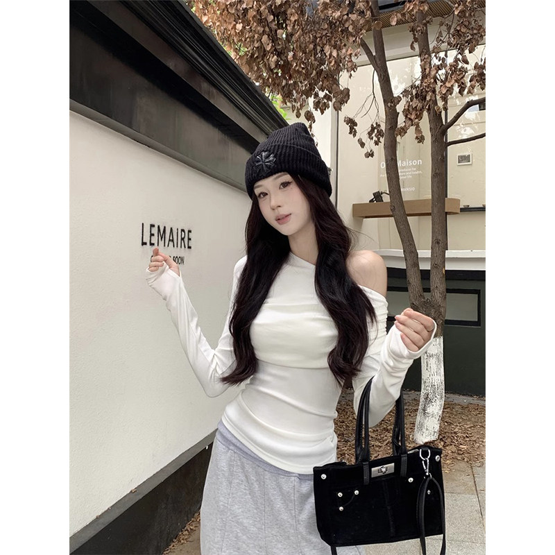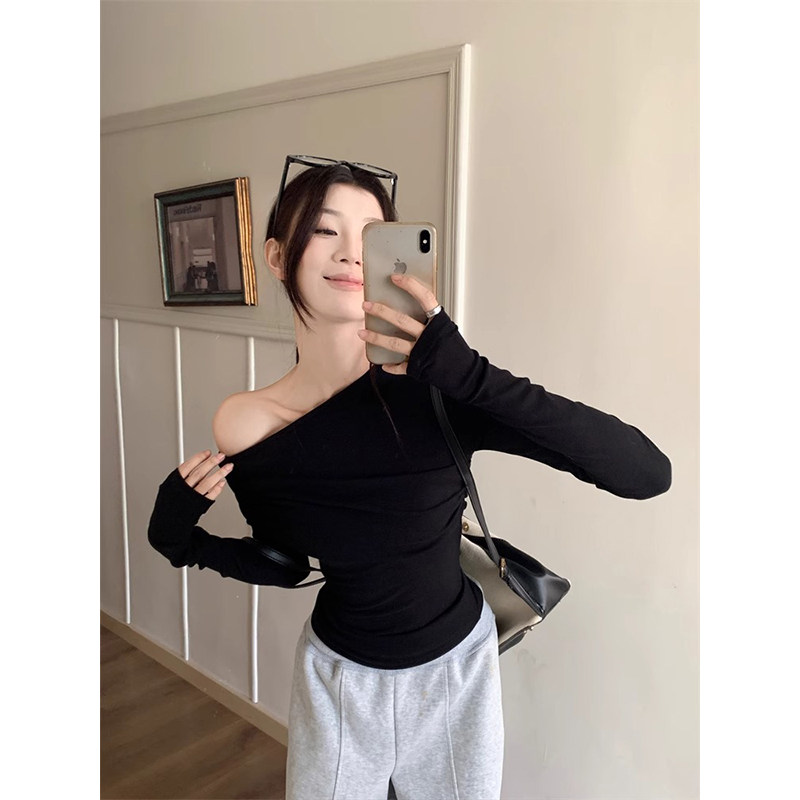 📚 绝美红色一字斜肩内搭打底衫女秋冬辣妹修身显瘦长袖t恤露肩上衣