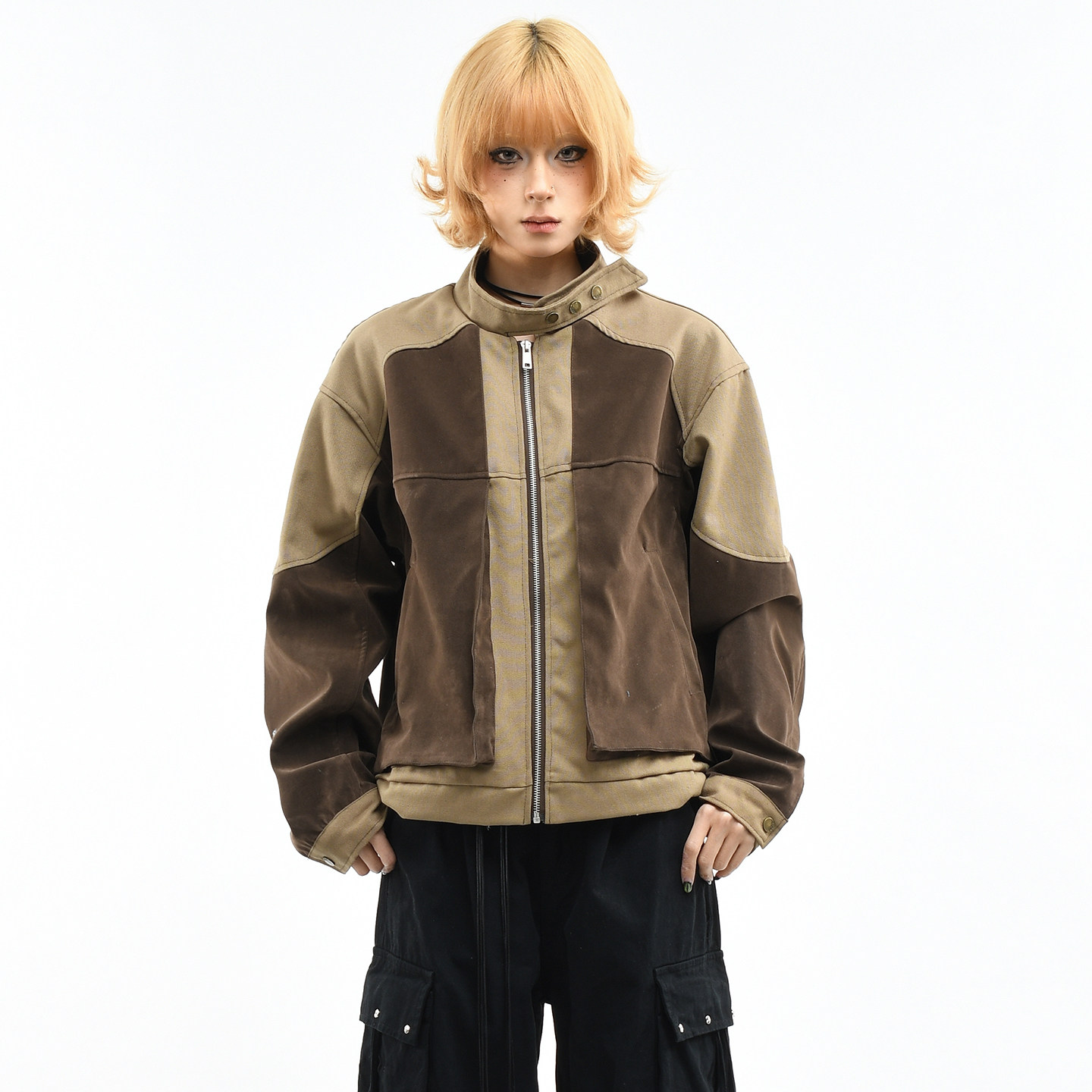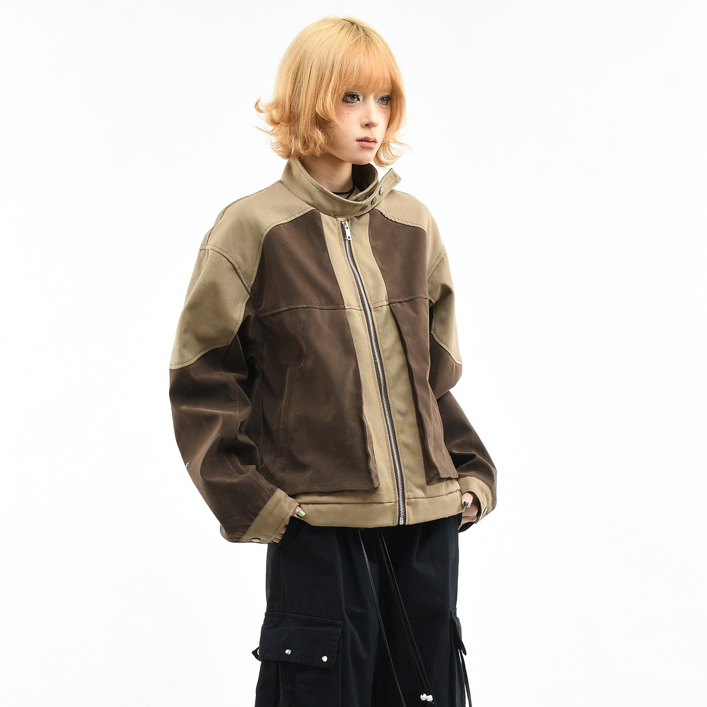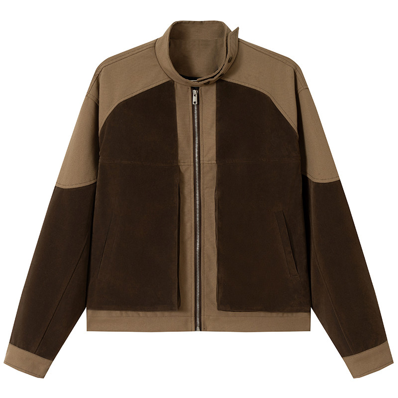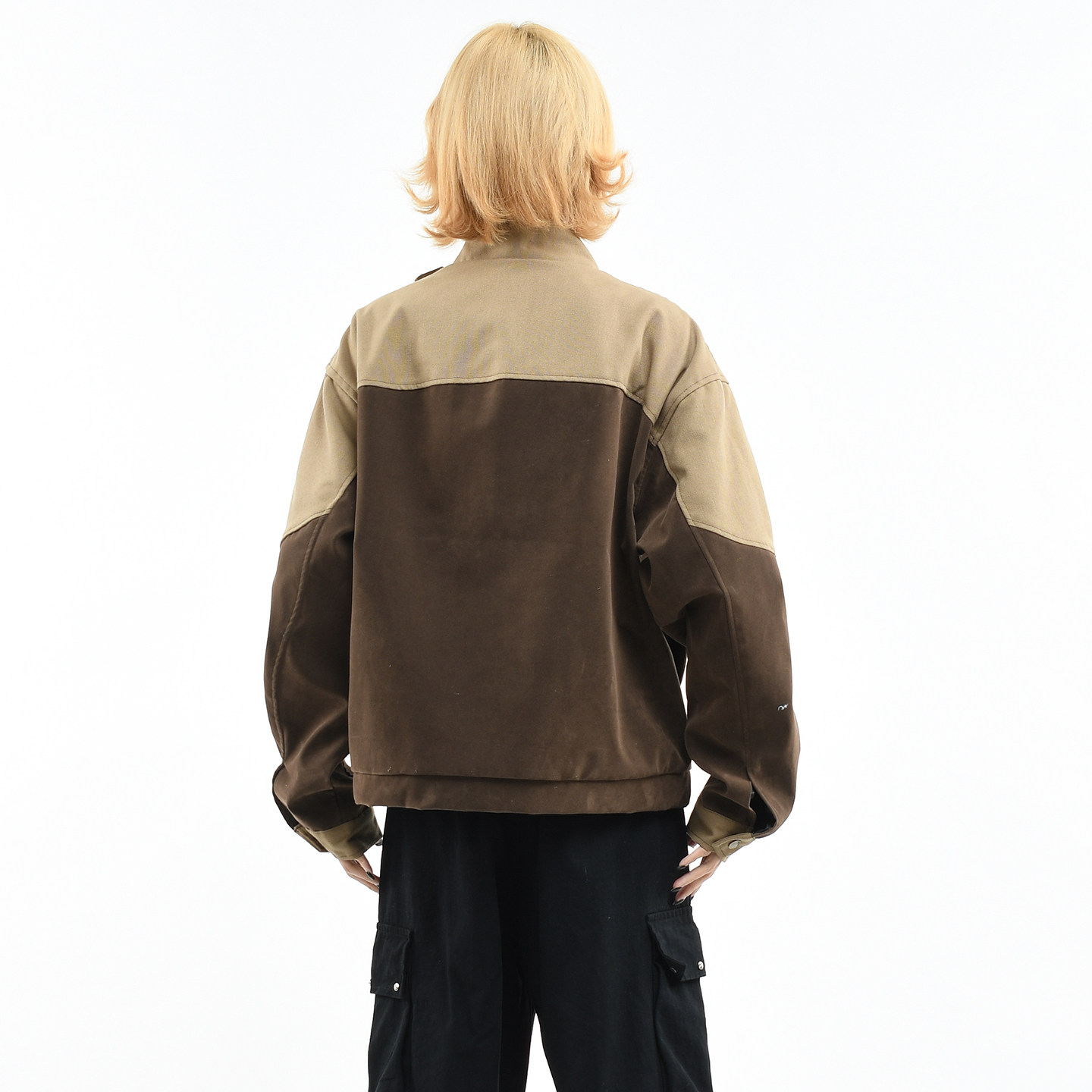 📚 OV原创美式复古麂皮绒撞色拼接立领外套女春季宽松机车痞帅夹克男