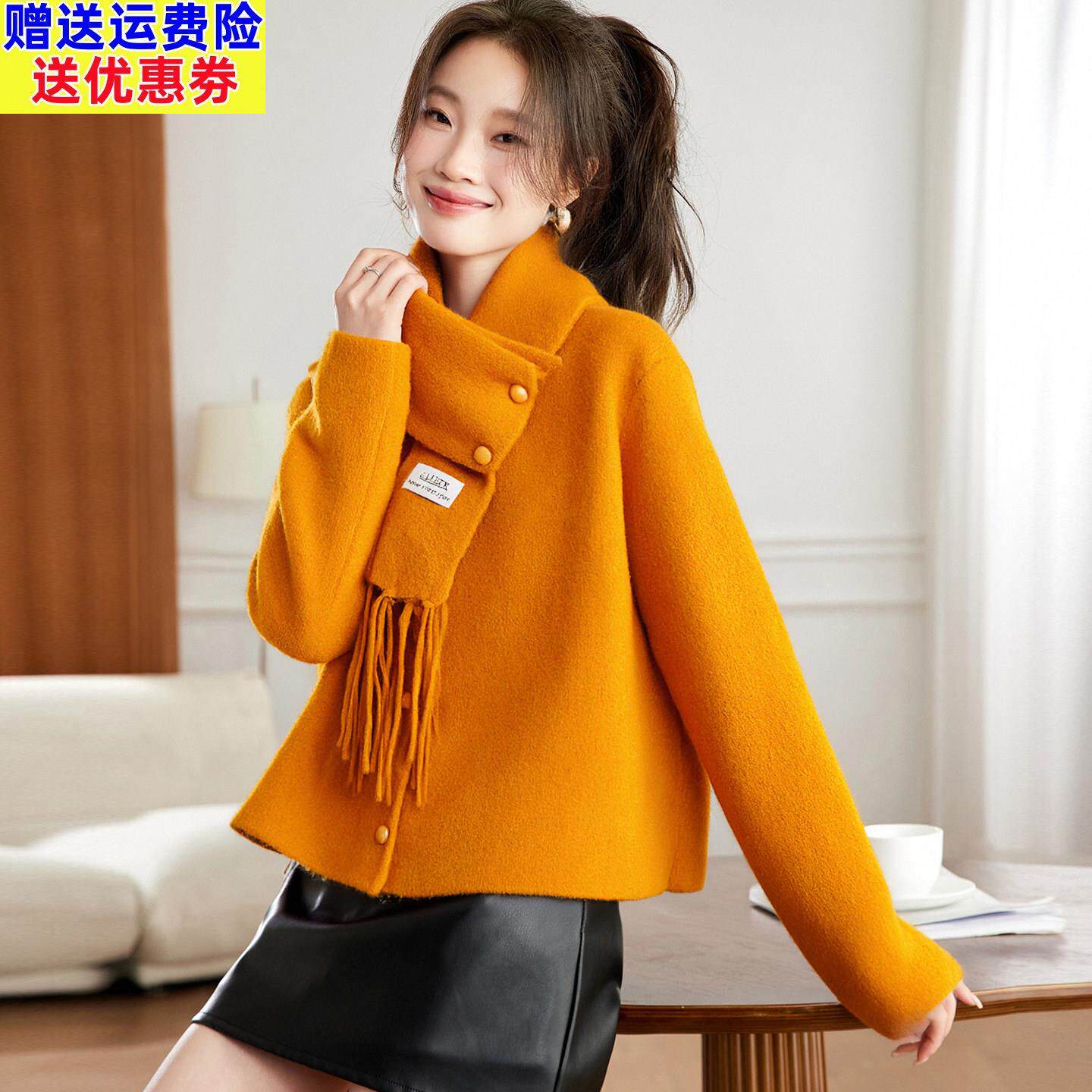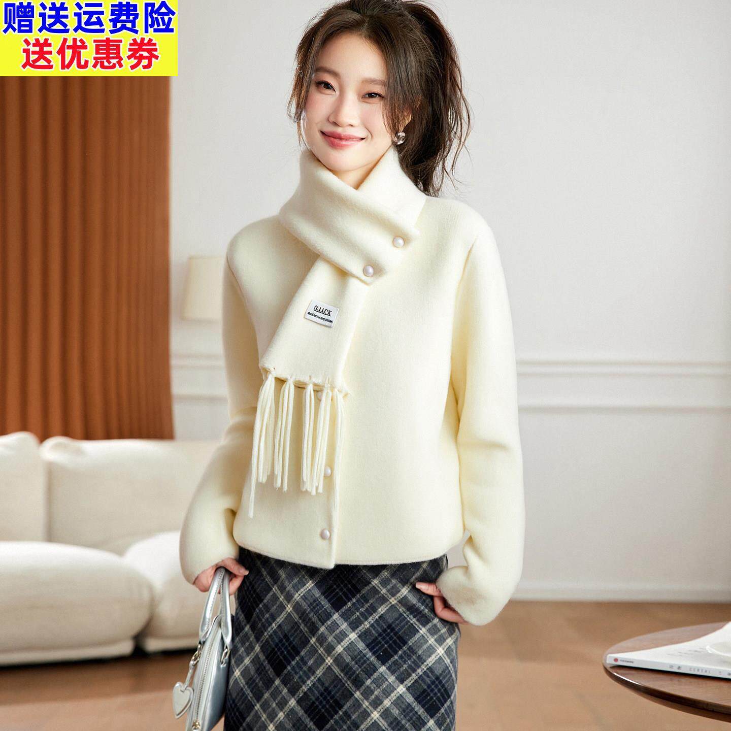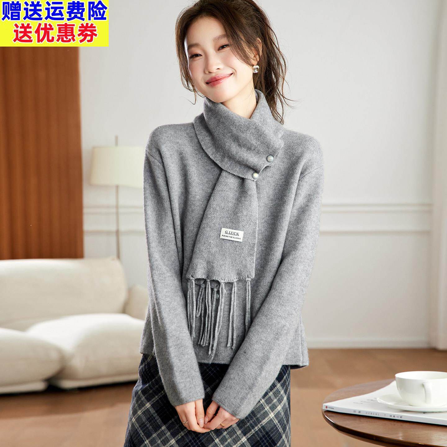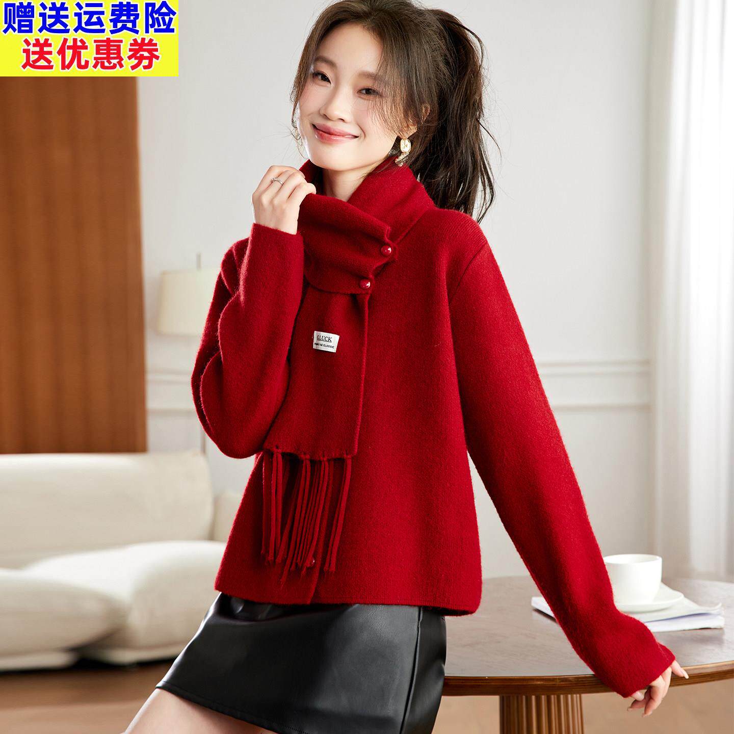 📚 本命年红色毛衣女外套圣诞新年时尚可拆流苏围巾圆领宽松针织开衫