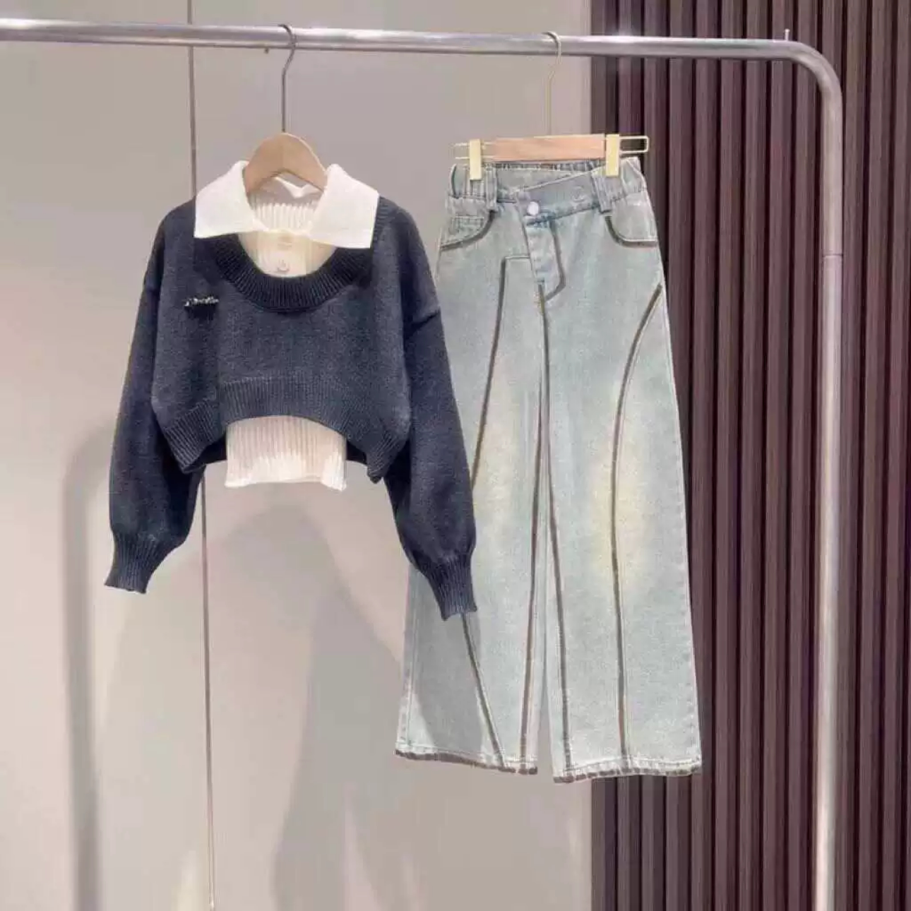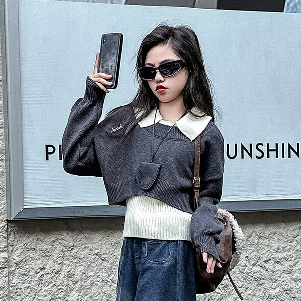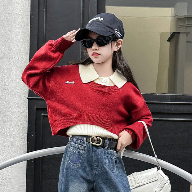 📚 2024秋冬新款女童设计感真两件POLO领毛衣个性牛仔阔腿裤套装韩版