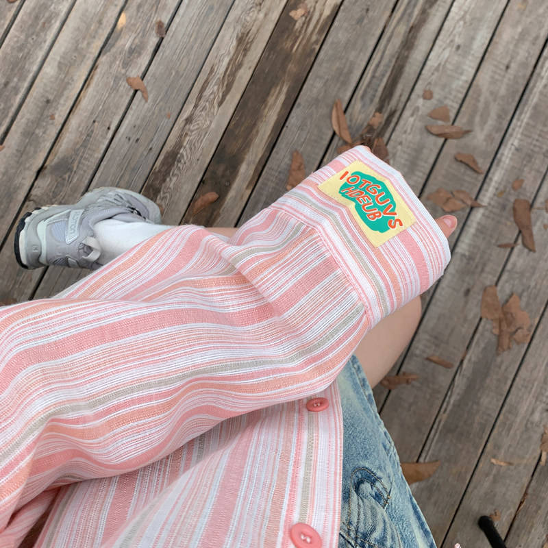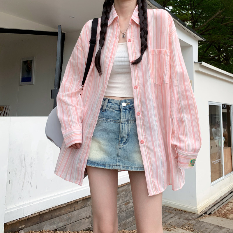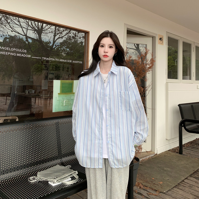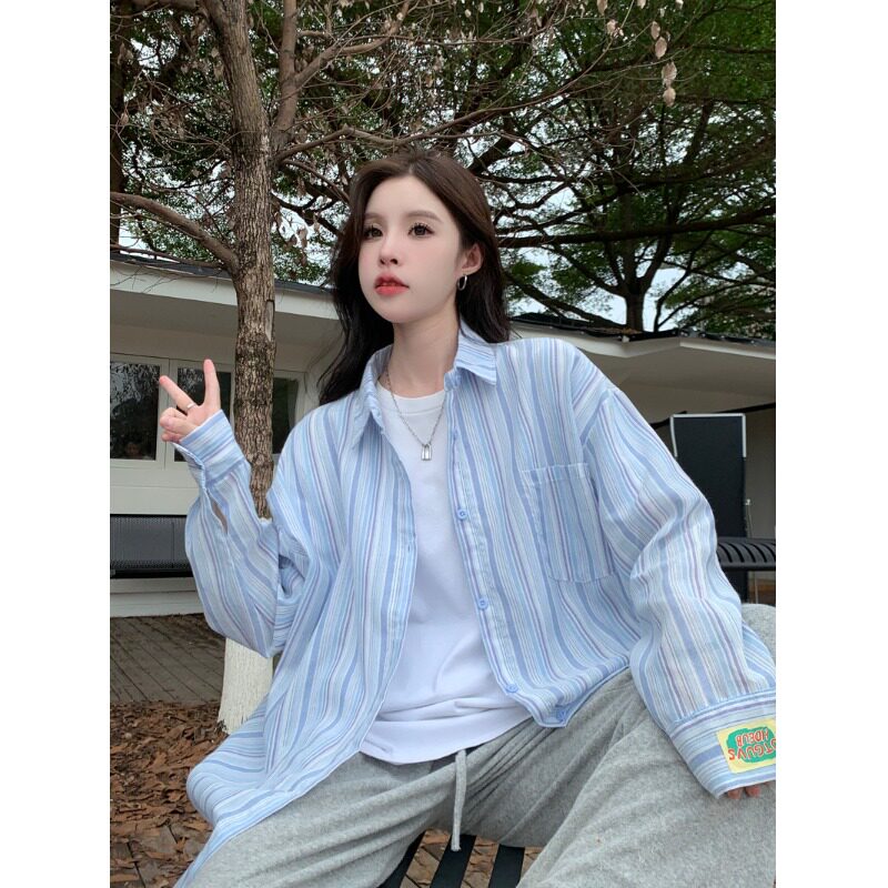 📚 薄款防晒条纹夏季蓝色衬衫上衣新款设计休闲宽松慵懒长袖衬衣外套