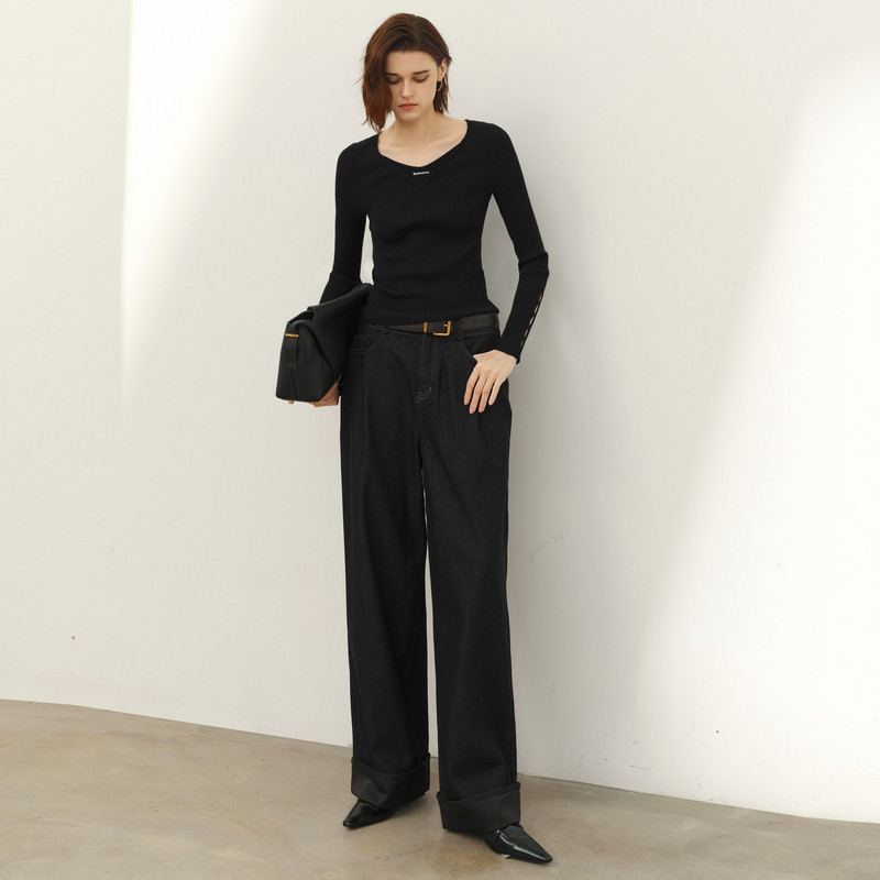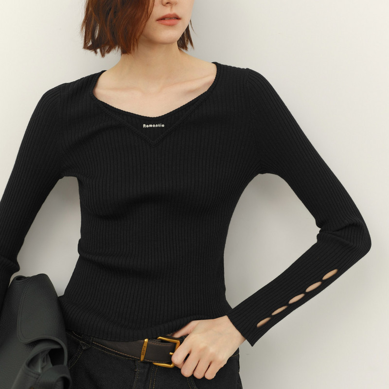 📚 U/TI黑色圆领长袖针织衫女套头修身显瘦打底毛衣尤缇2026春季新款
