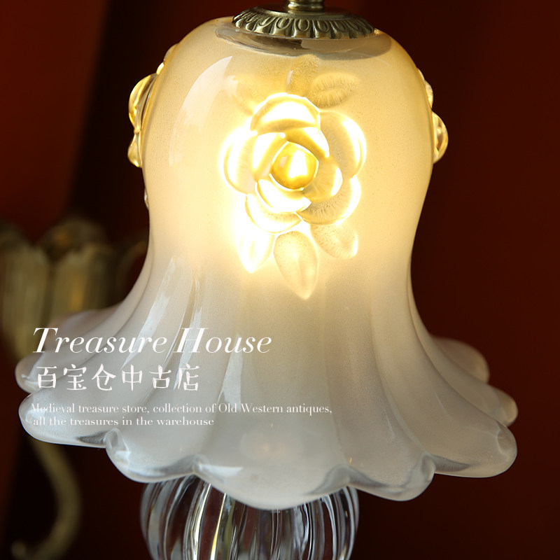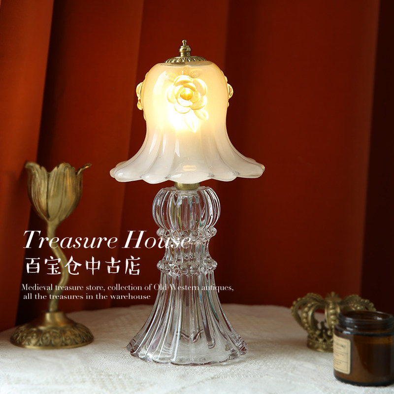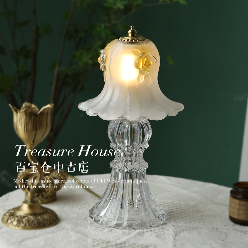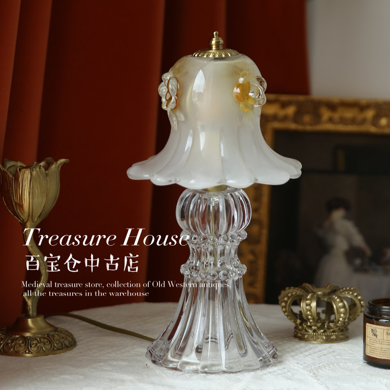 📚 Vintage中古花朵水晶手工玻璃台灯Murano法式浪漫复古卧室床头灯