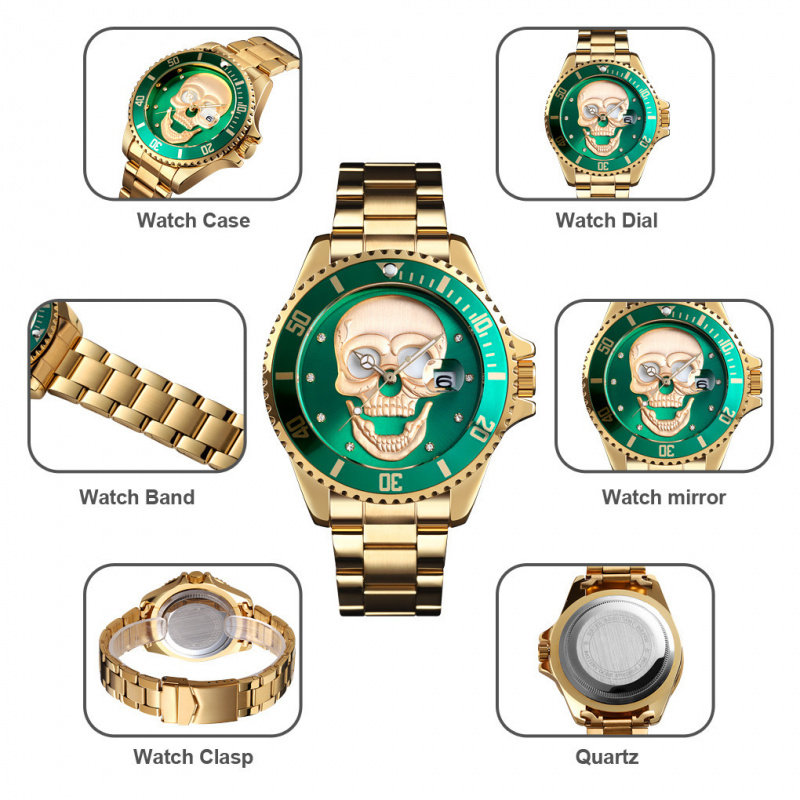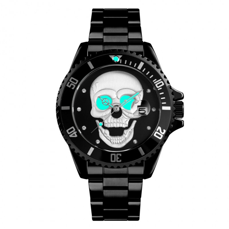 📚 手表时尚欧美网红同款镶水钻骷颅头夜光男士防水石英表日历腕表潮