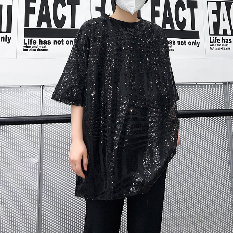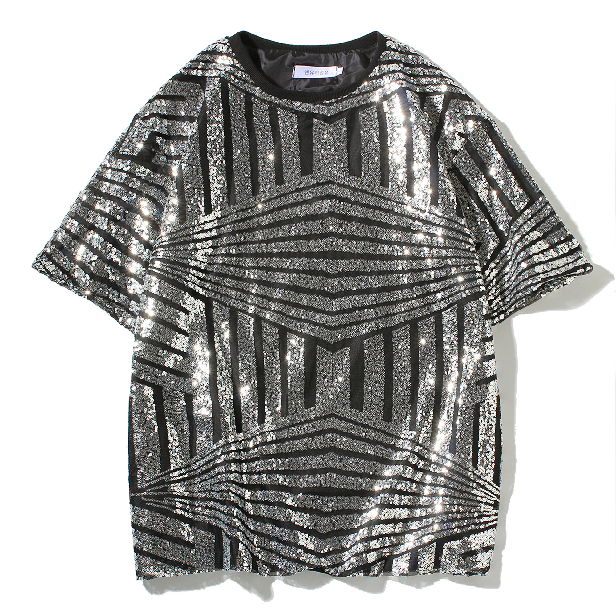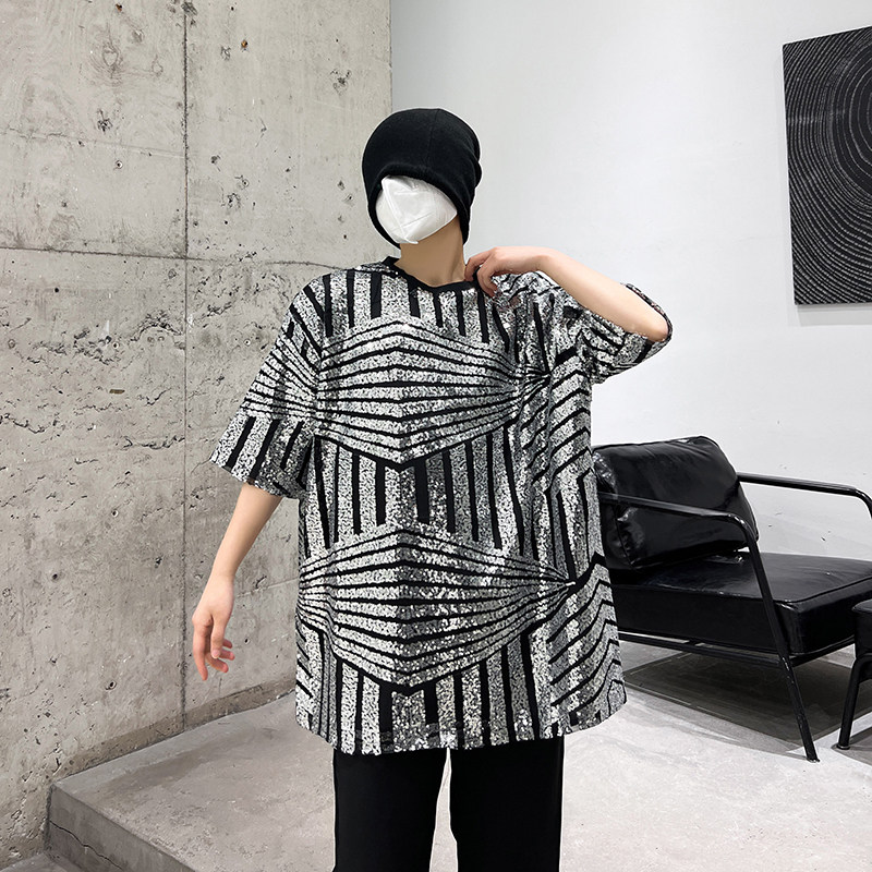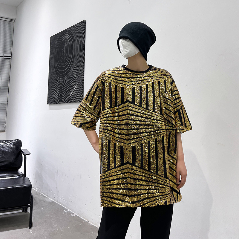 📚 夏季金色银色亮片设计感宽松T恤男女短袖炸街痞帅高级演出舞台装