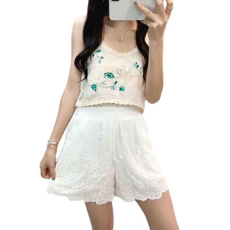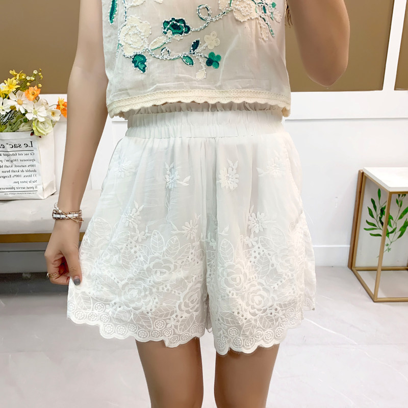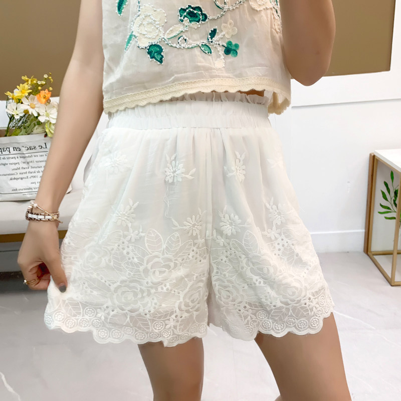 📚 棉麻短裤女蕾丝刺绣花边阔腿裤2025夏季新款松紧腰热裤薄款休闲裤