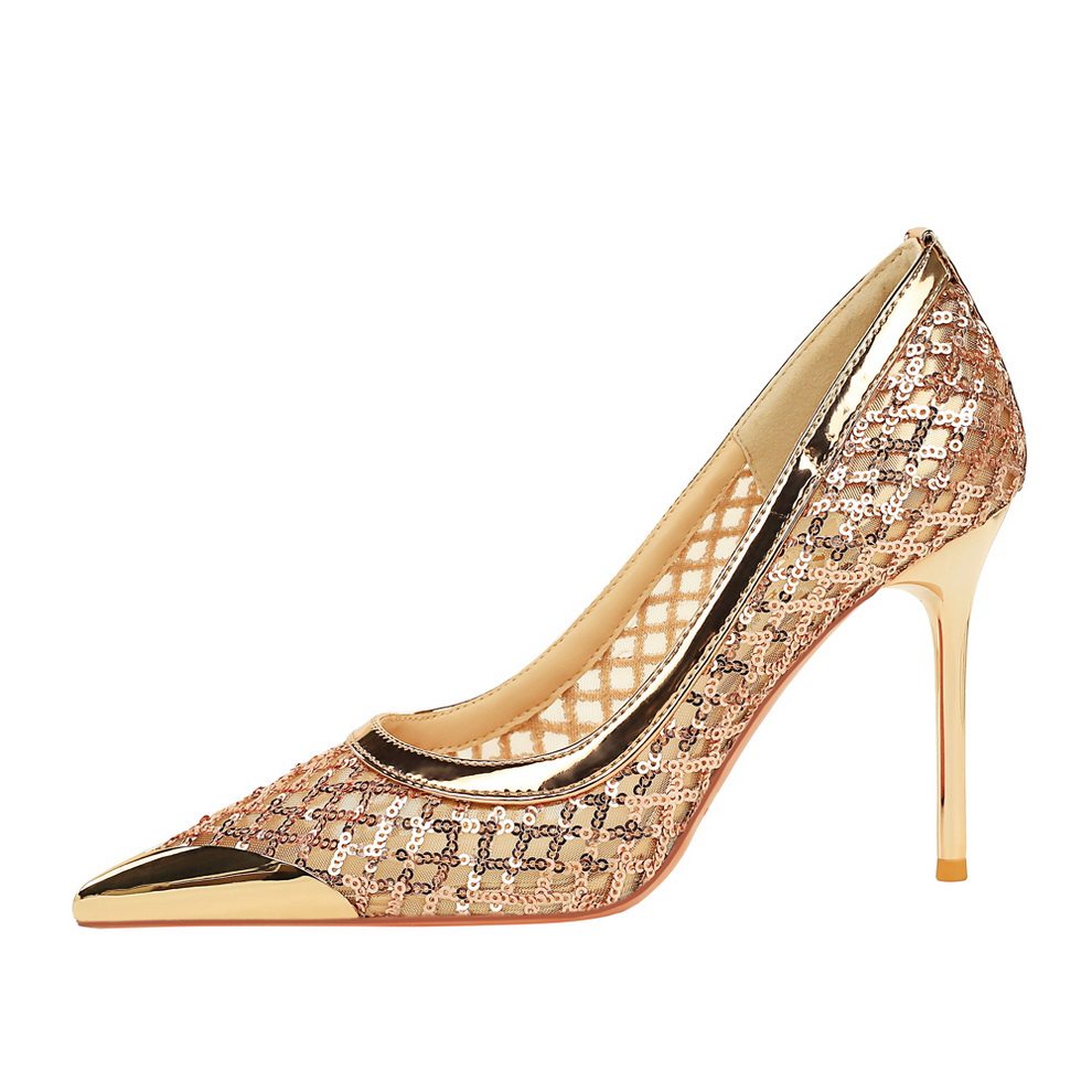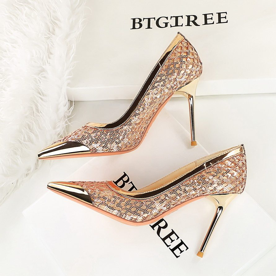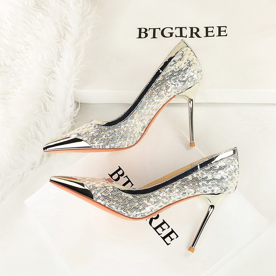 📚 法式金属尖头高跟鞋女亮片网纱透气时尚亮面高级感宴会鞋细跟单鞋