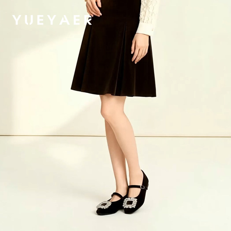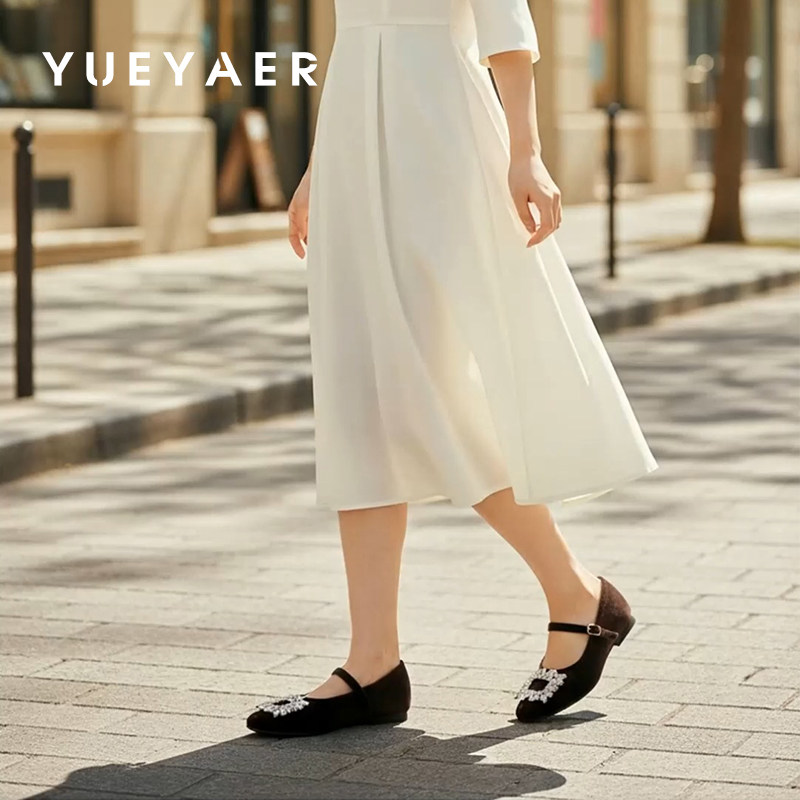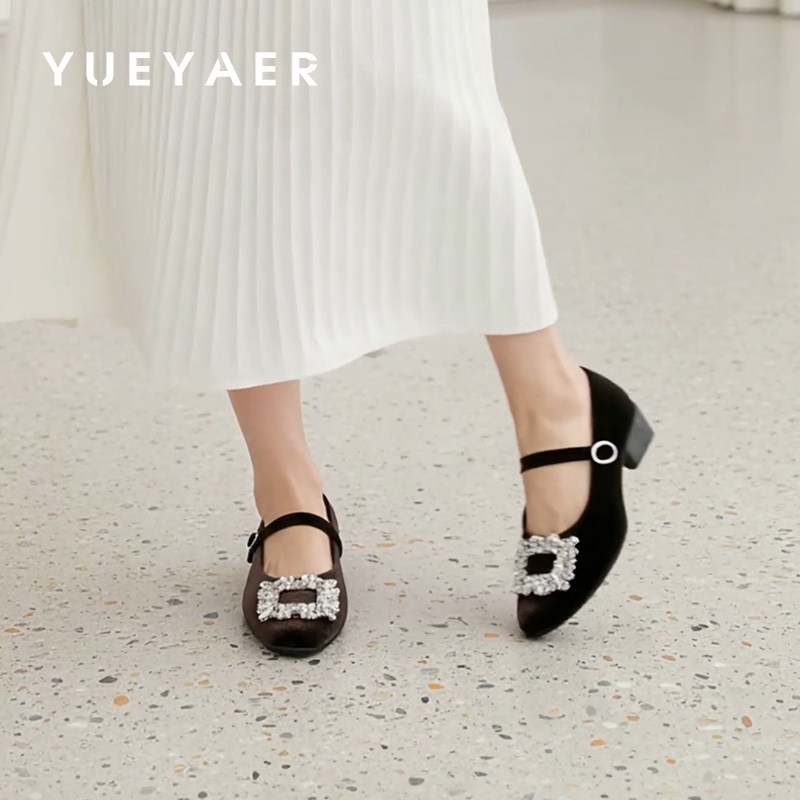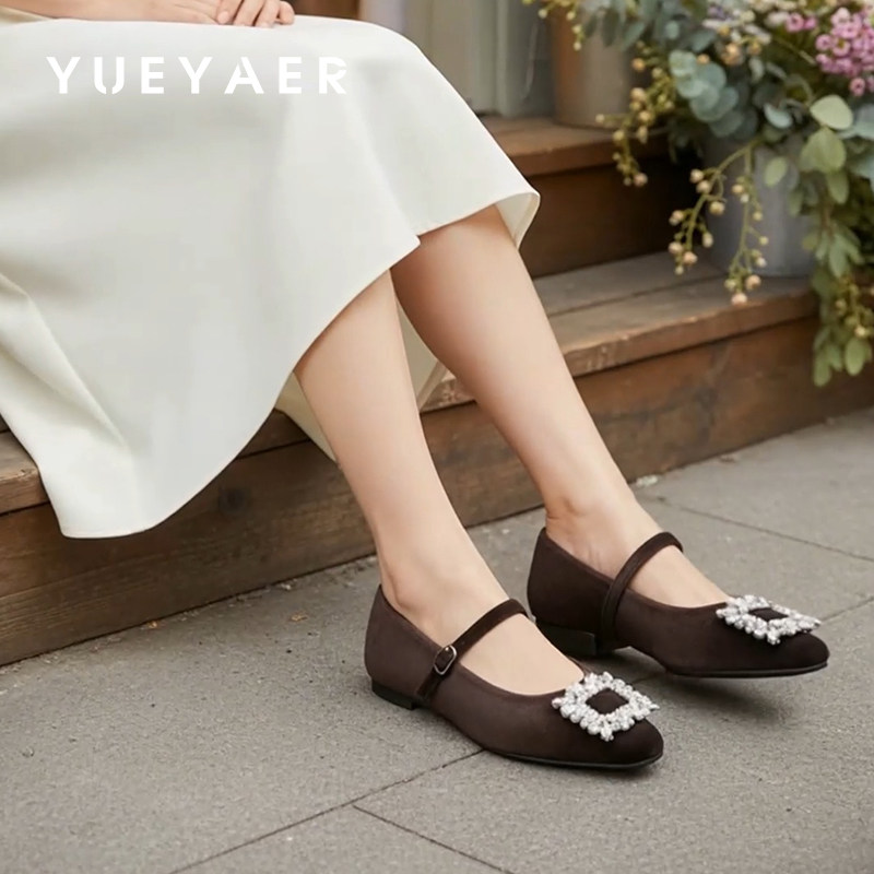 📚 月芽儿平底玛丽珍鞋女2026春季新款水钻方扣浅口一字带法式小皮鞋