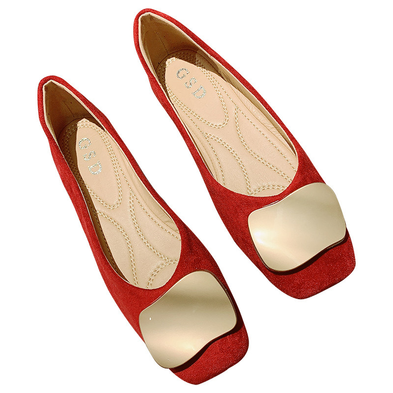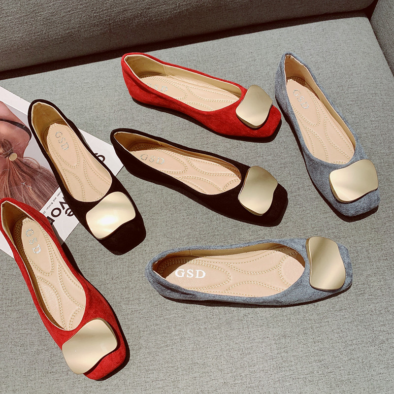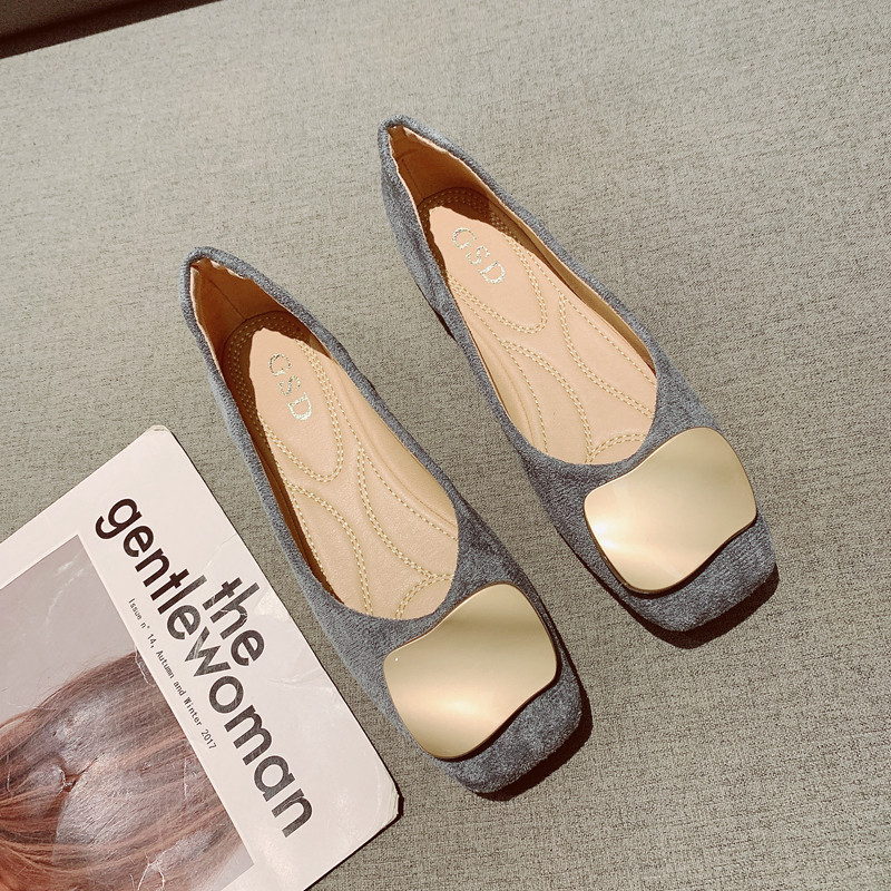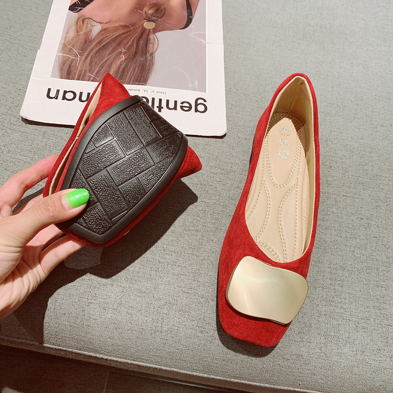 📚 2026年新款绒面浅口方头平底单鞋女金属扣舒适软底豆豆鞋大码瓢鞋