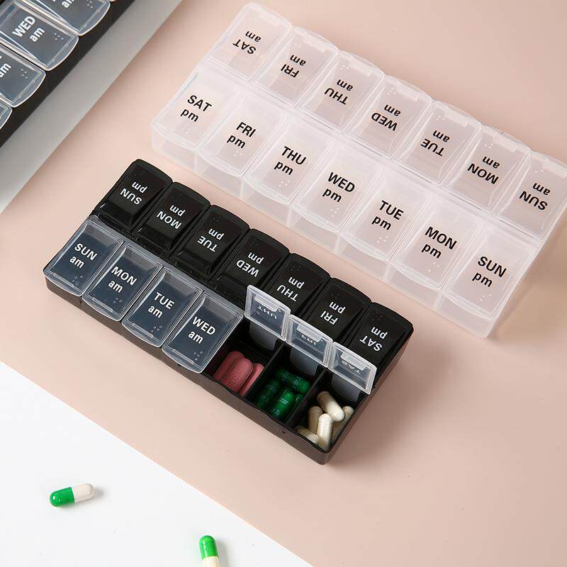 📚 7天早晚双排分装药盒分装盒14格带盲文一周药盒便携收纳药品定制