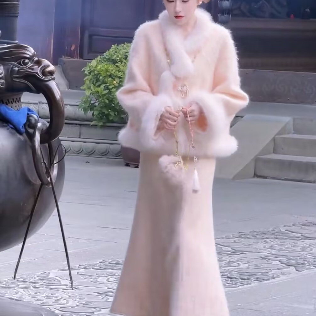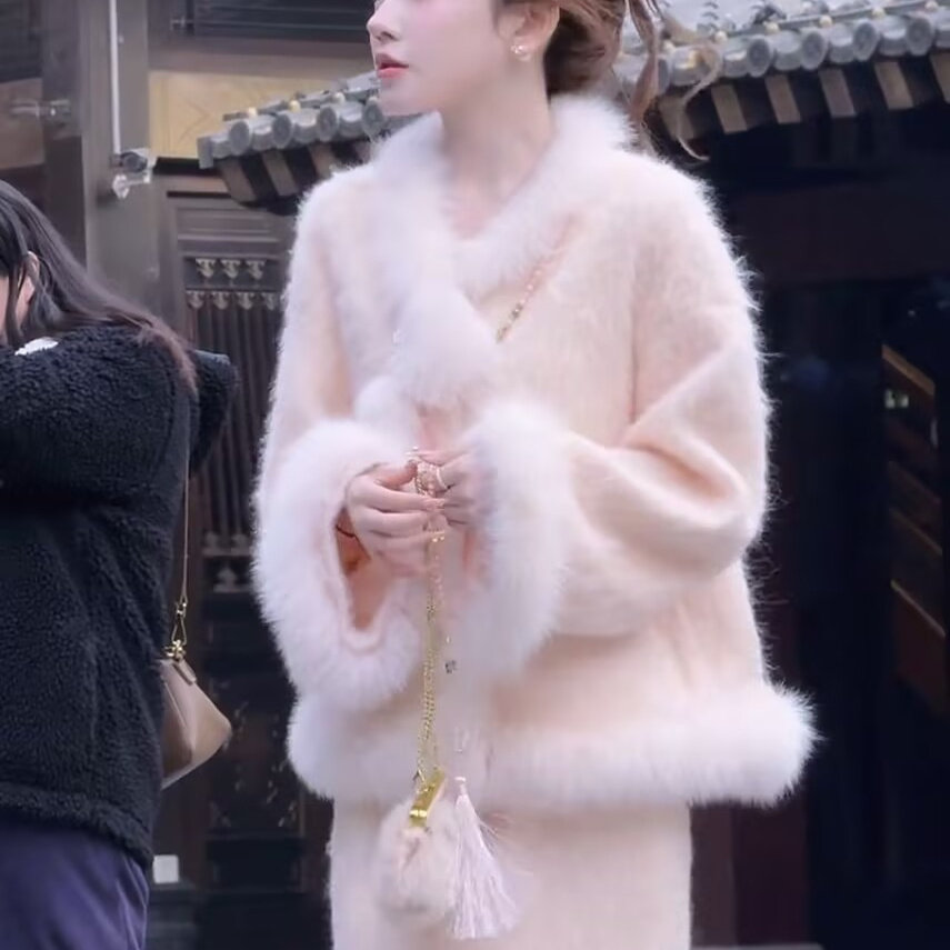 📚 新中式国风棉服套装女2025冬季新款粉色宽松显瘦毛毛边外套半身裙