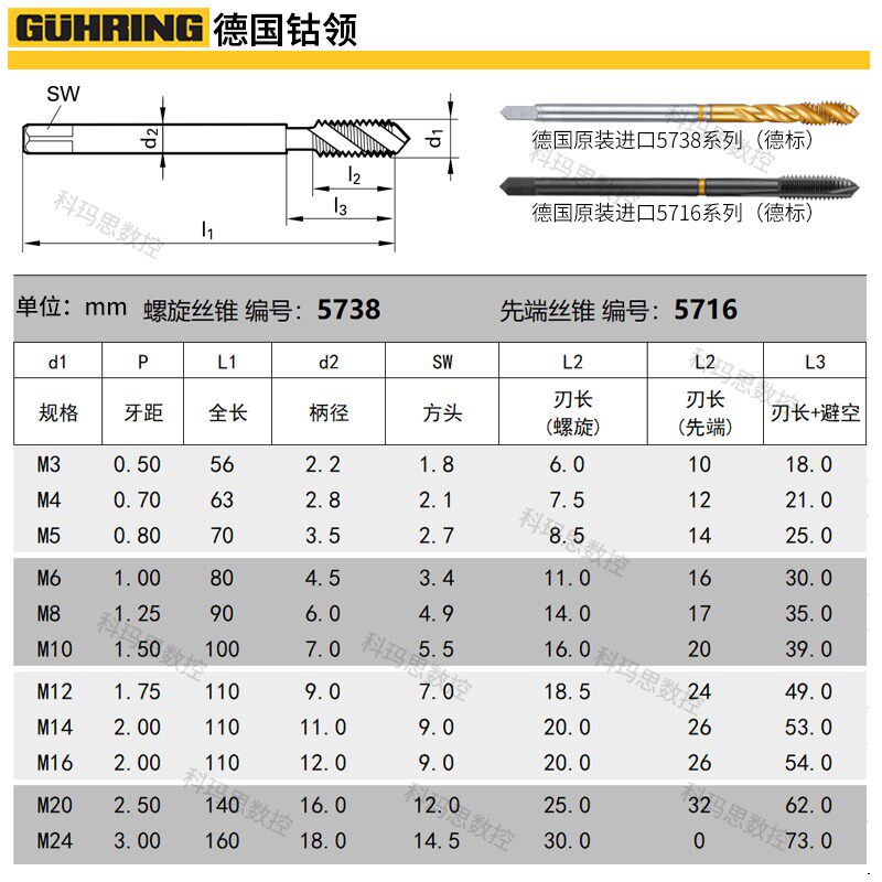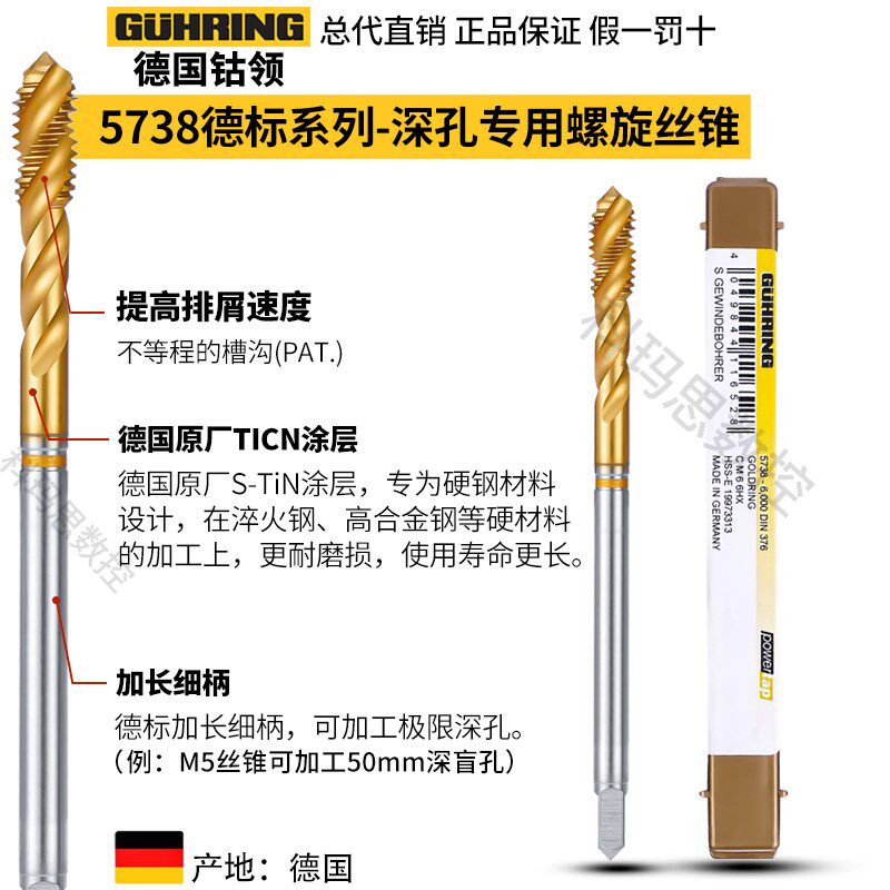 📚 德国进口钴领5738深孔镀钛螺旋丝锥小柄M3-M20钢用细柄5716先端