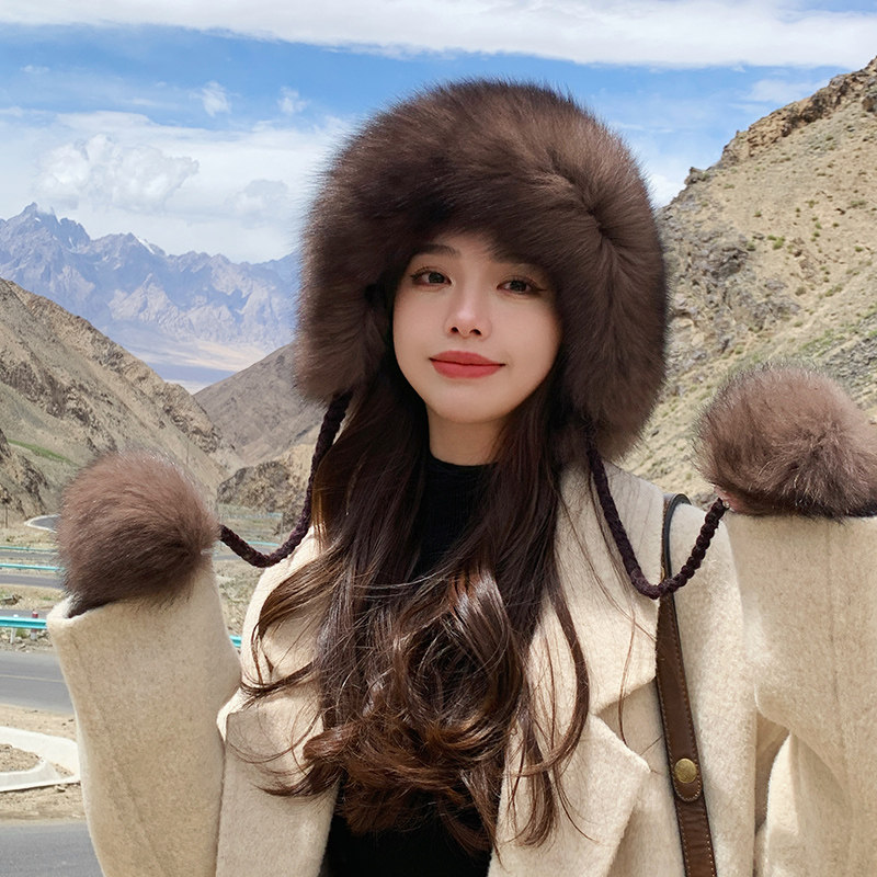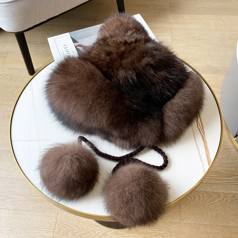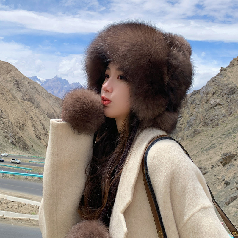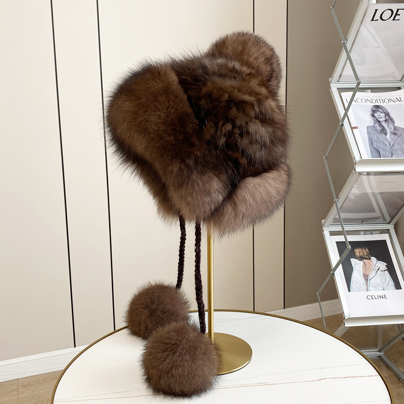 📚 冬季保暖高档紫貂毛编织水貂毛皮草帽子狐狸毛球球女士护耳貂皮帽