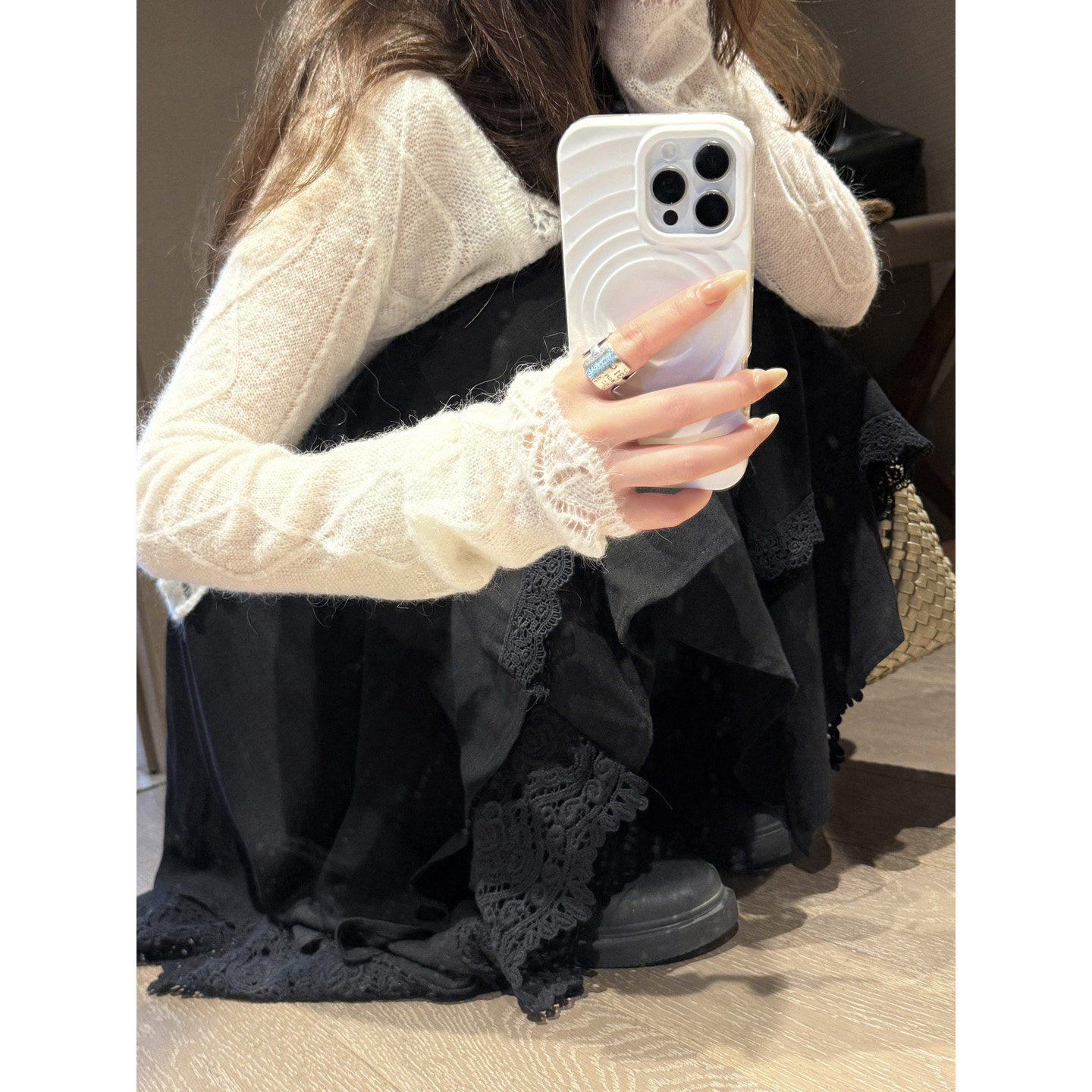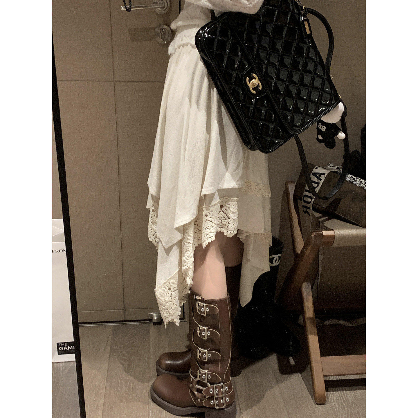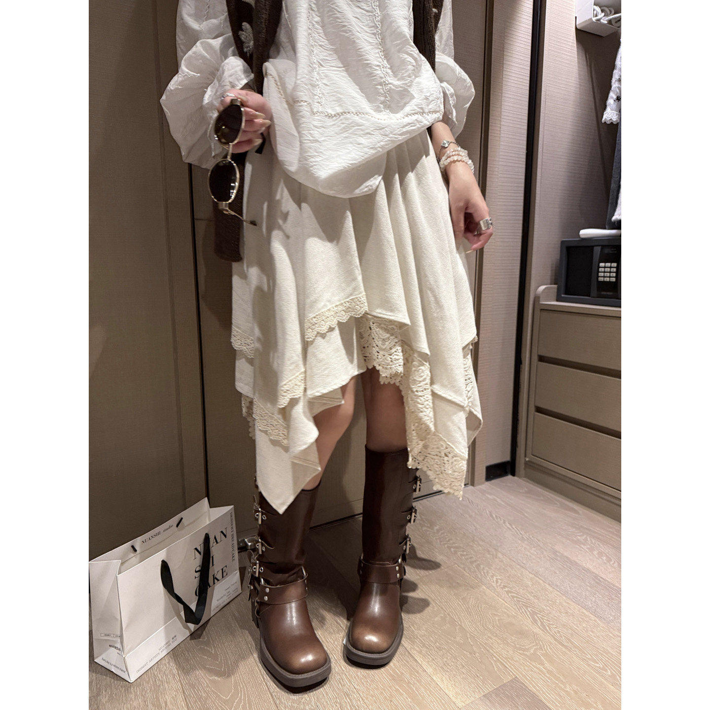 📚 fancccy 不规则亚麻半身裙女2026秋春新款勾花蕾丝拼接设计感中裙