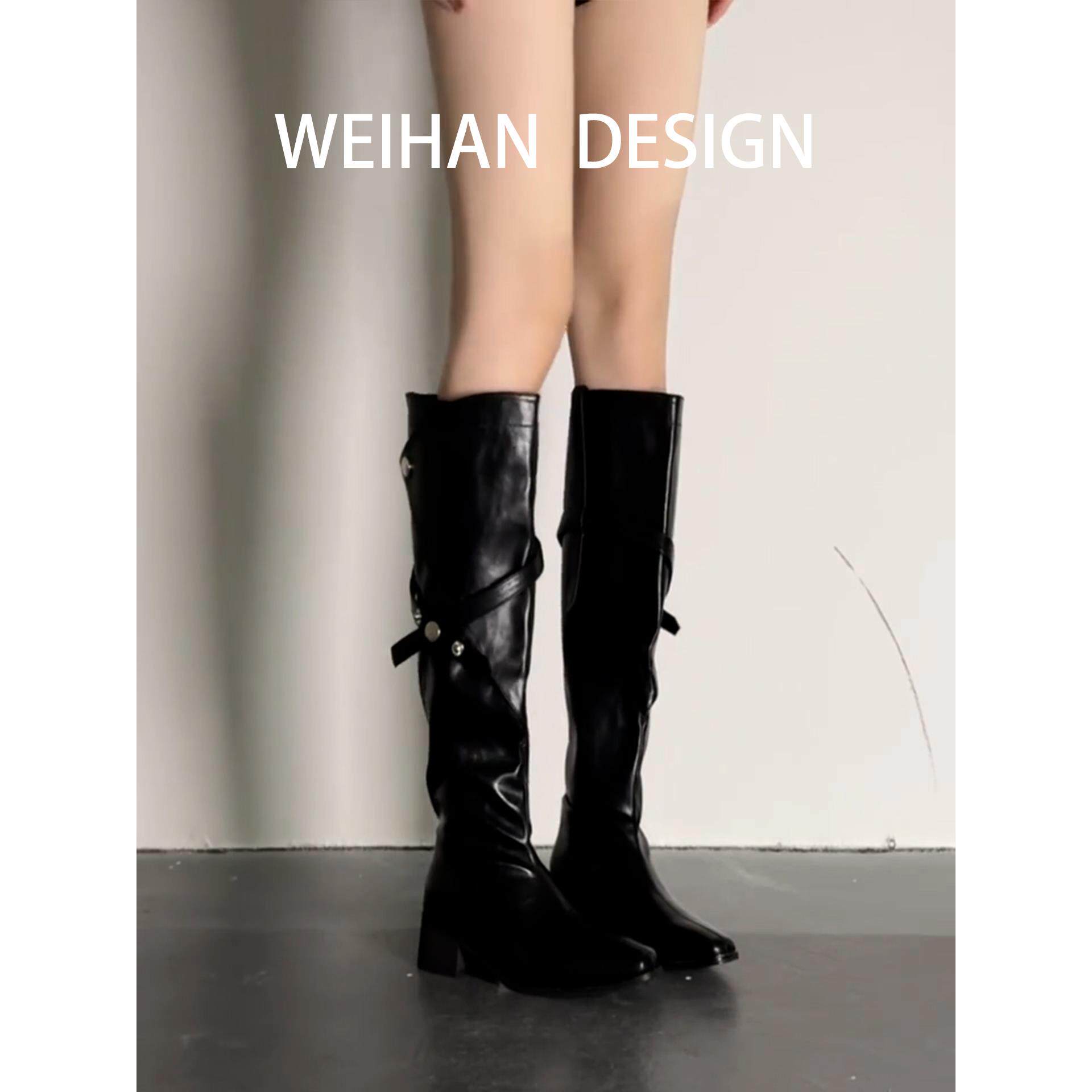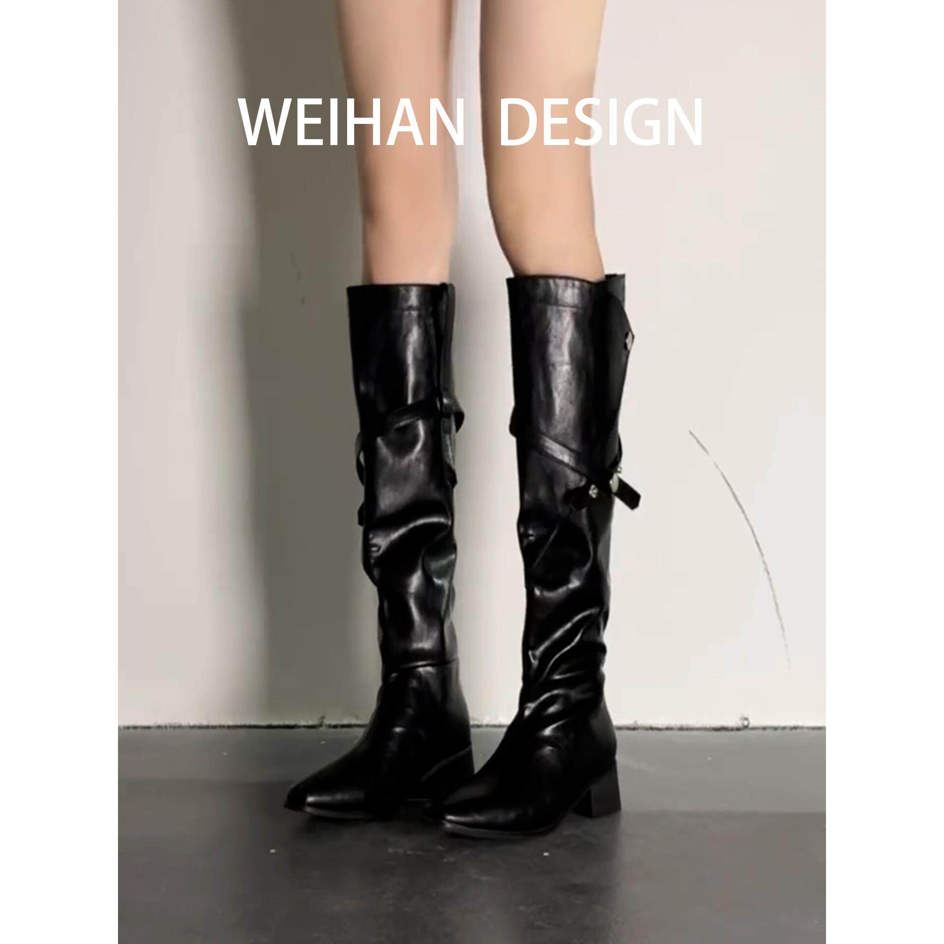 📚 羊皮版!尖头显瘦粗跟长靴黑色秋冬高筒骑士靴英伦风皮带扣时装靴