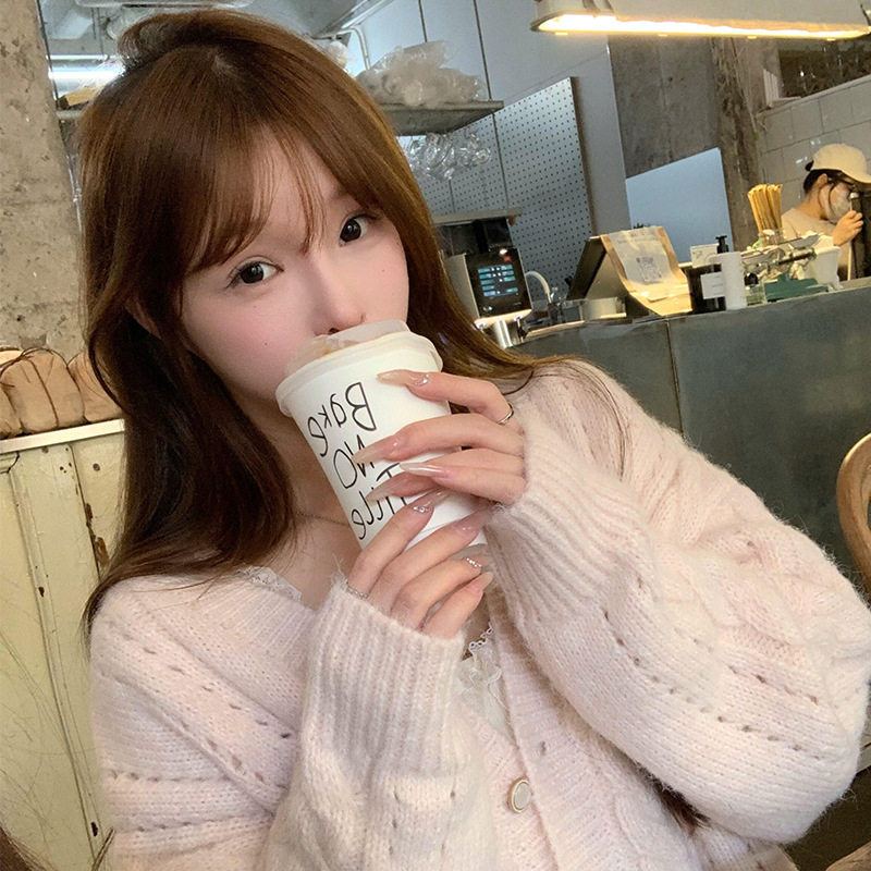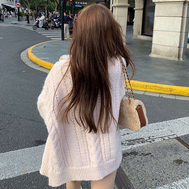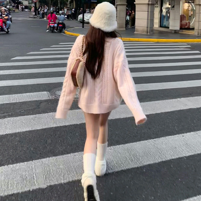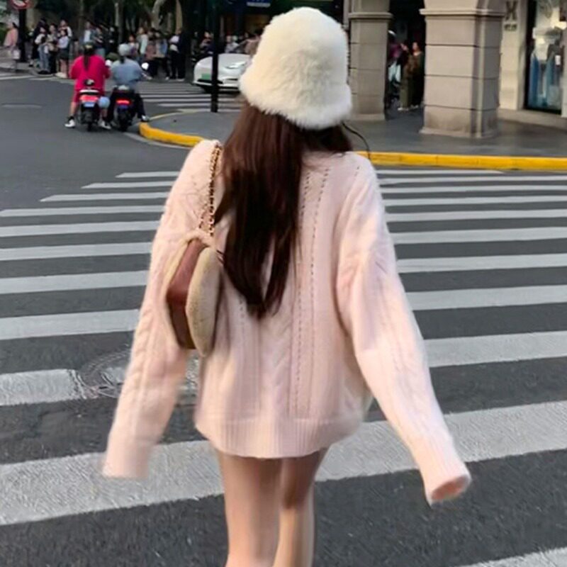 📚 粉色v领宽松大码胖mm毛衣外套女春秋季慵懒麻花针织开衫百搭上衣