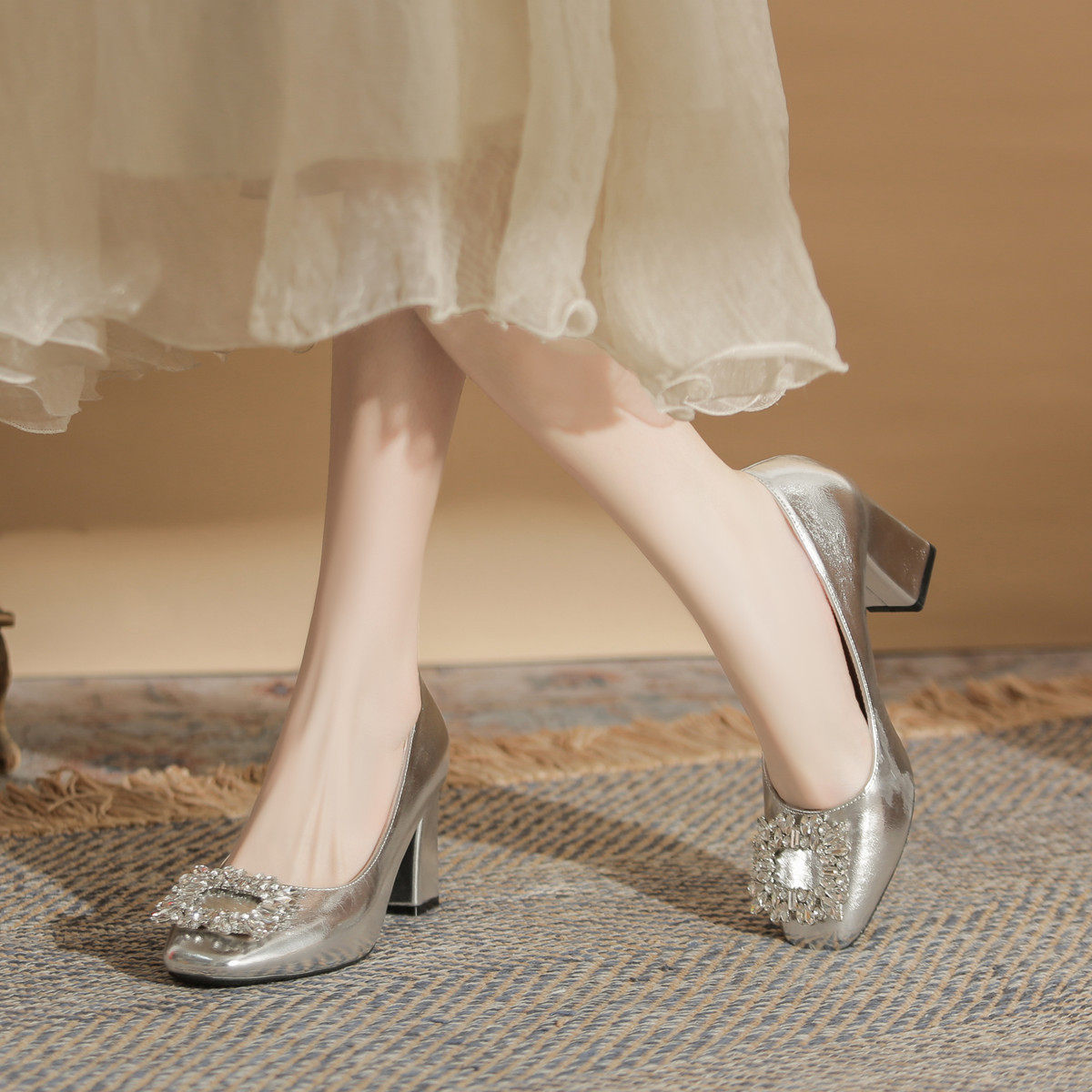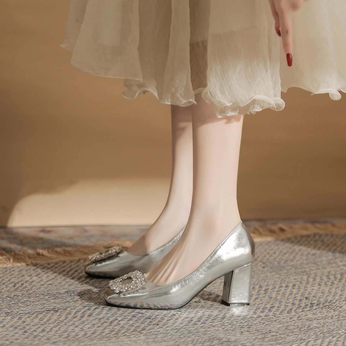 📚 银色高跟鞋女2024新款通勤粗跟单鞋不累脚大码女鞋41一43加肥加宽