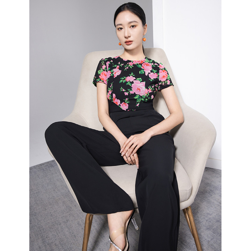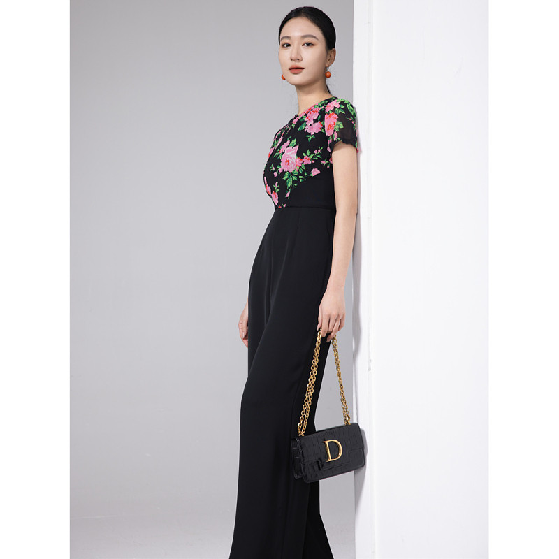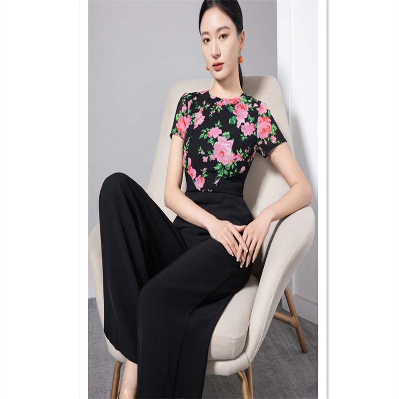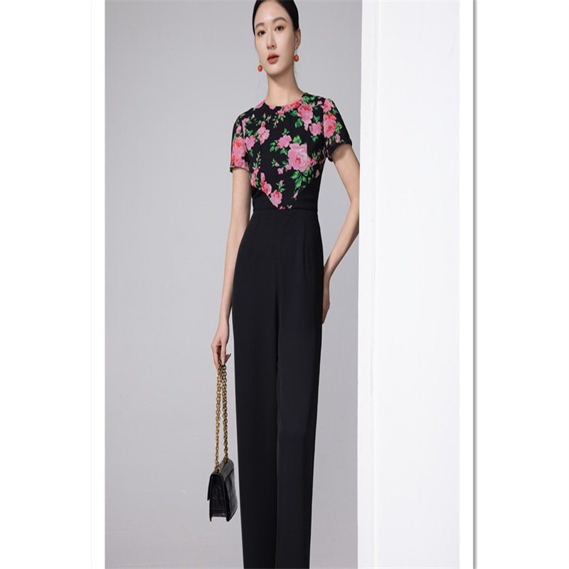 📚 气质女神范连体裤花色拼接短袖超瘦腰高腰百搭雪纺薄款连身裤长裤