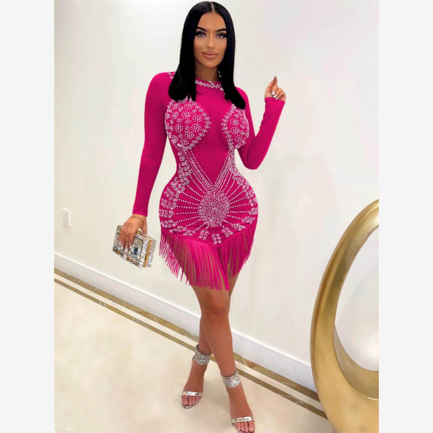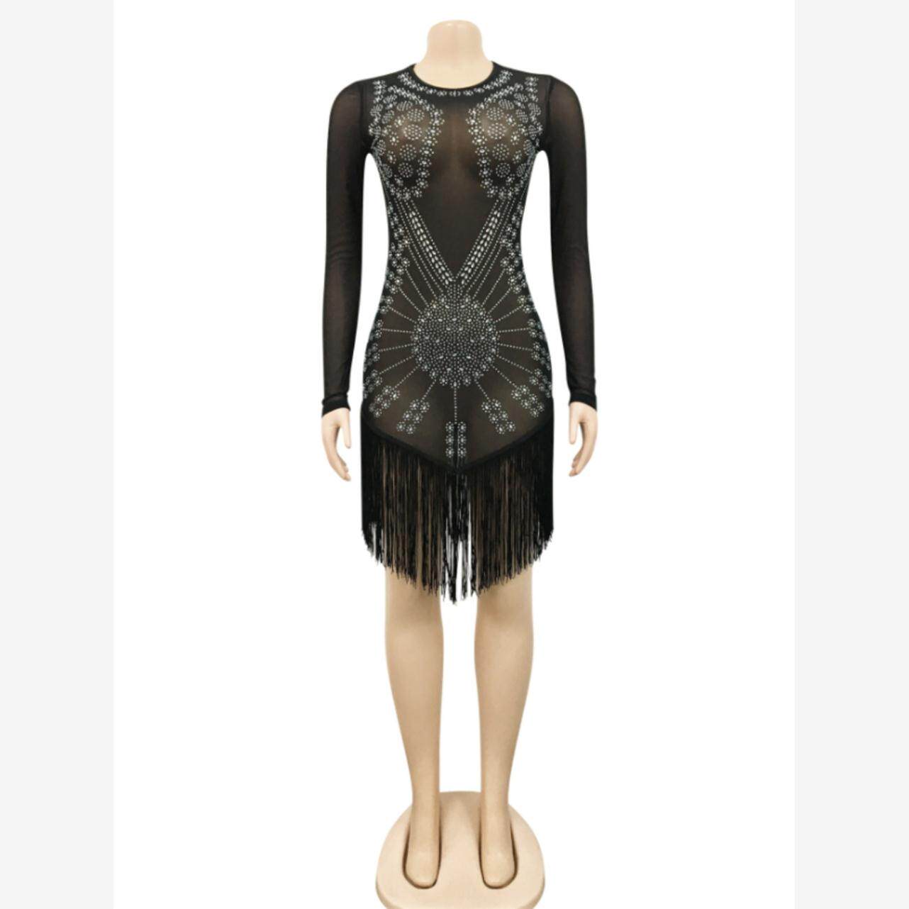 📚 Hot Drill Fringed Dress 欧美性感网纱透视烫钻长袖不规则流苏裙