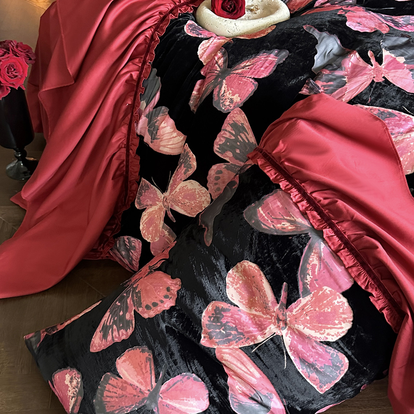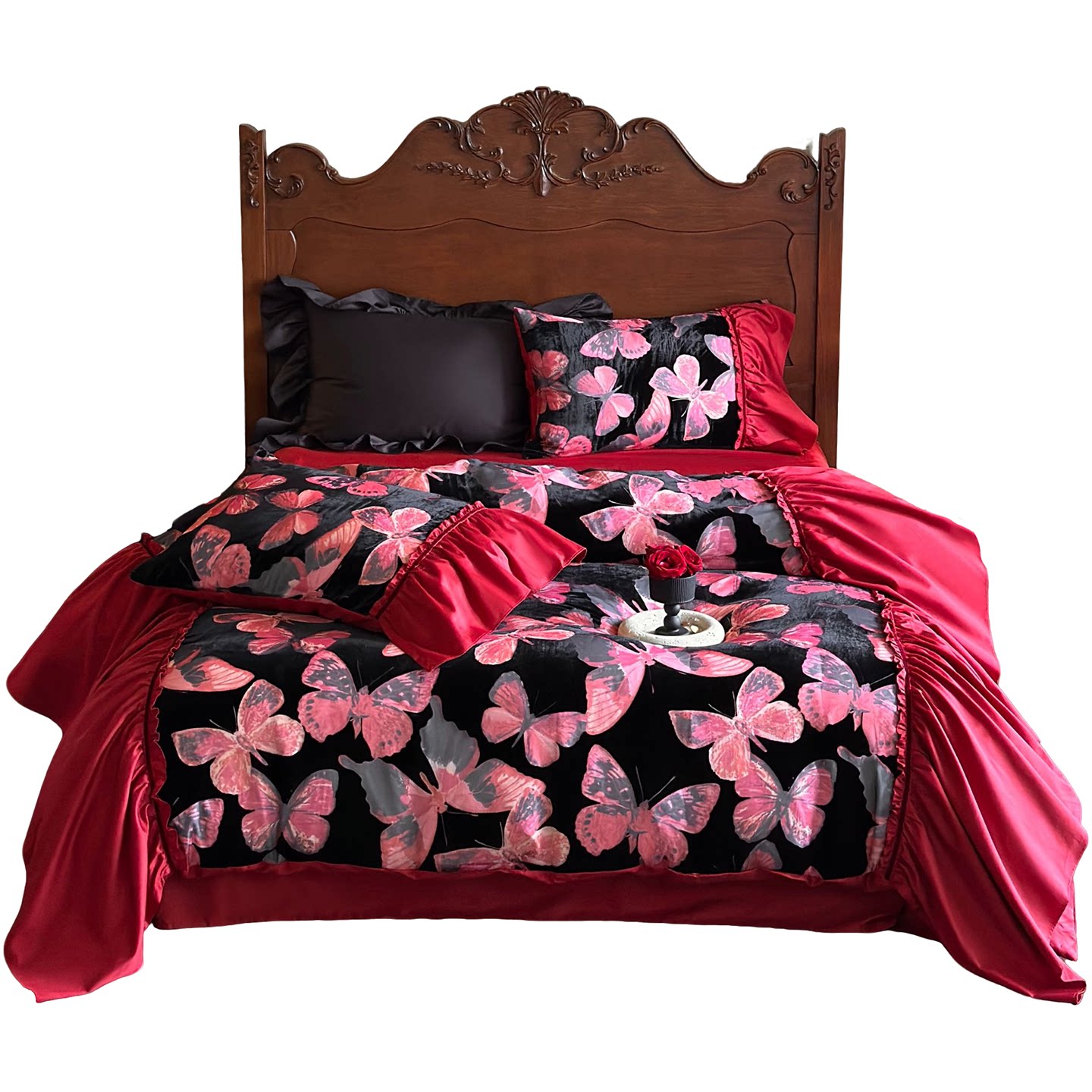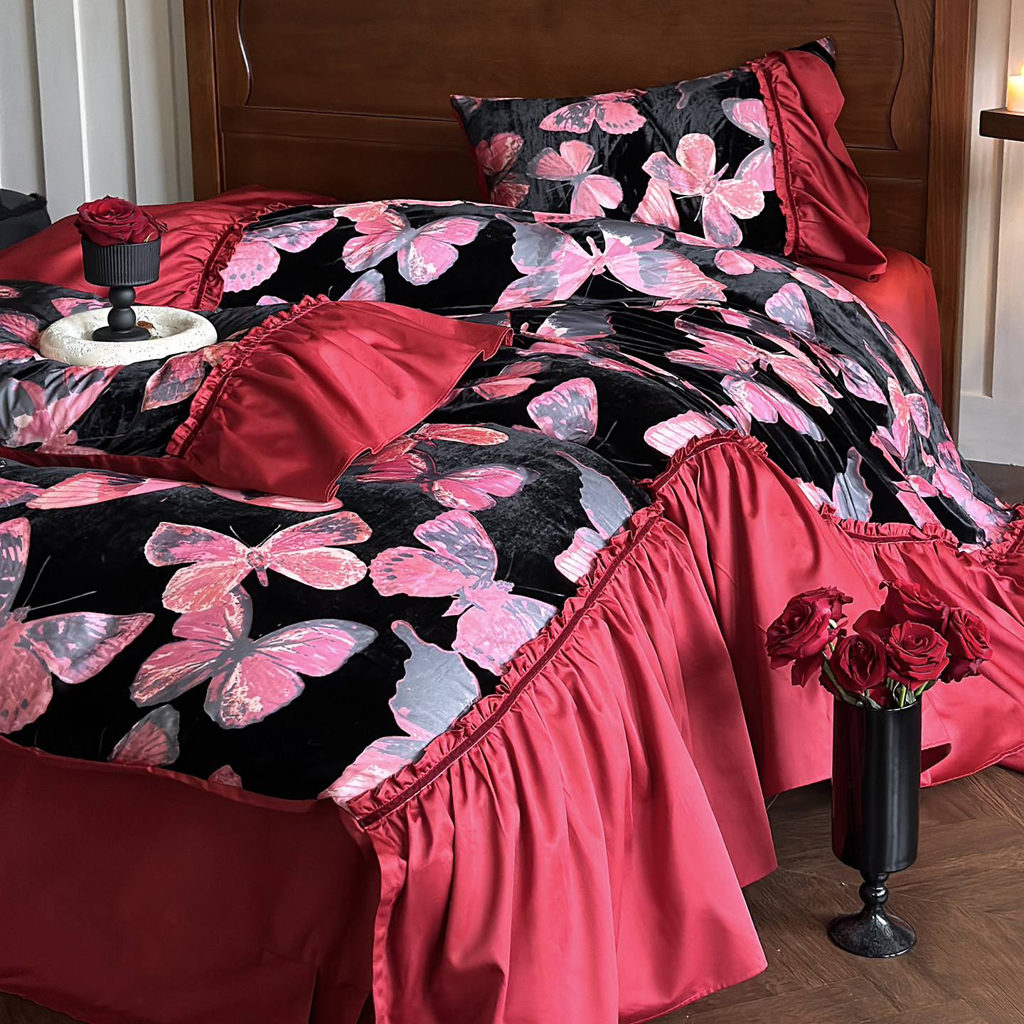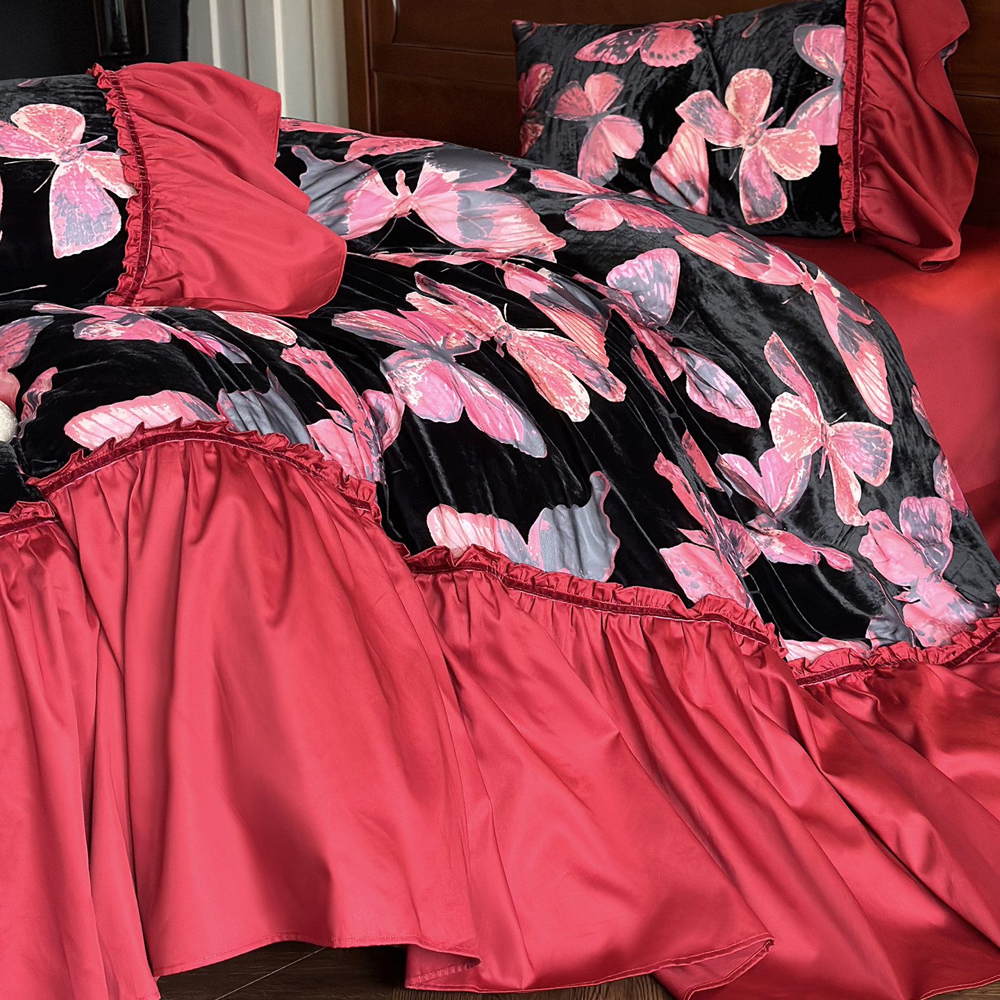 📚 法式复古蝴蝶印花全棉长绒棉四件套纯棉被套床单公主红色结婚床品