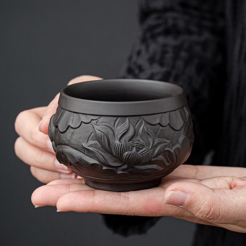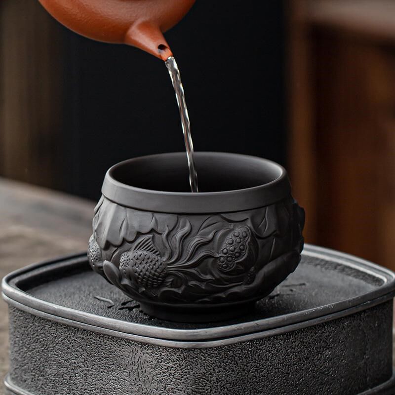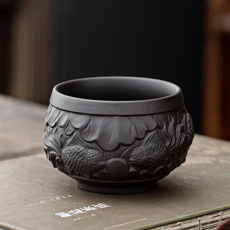📚 豪跃复古紫砂主人杯莲莲有鱼浮雕茶杯茶盏杯子功夫茶具品茗杯单杯