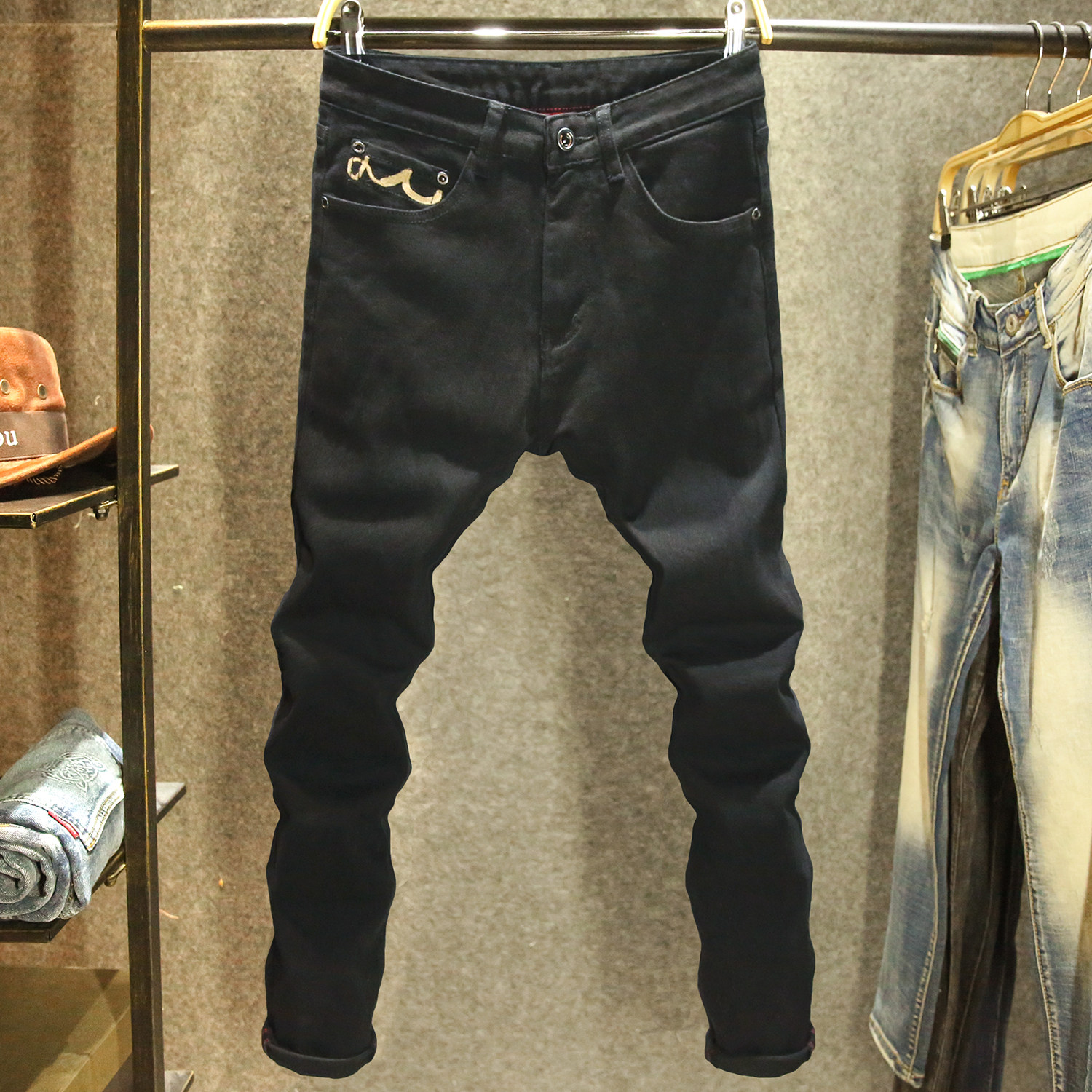 📚 纯黑色潮流百搭牛仔裤男款修身小脚弹力长裤潮牌时尚刺绣休闲裤子