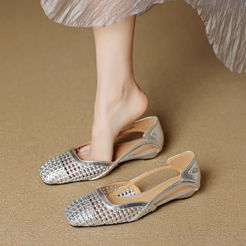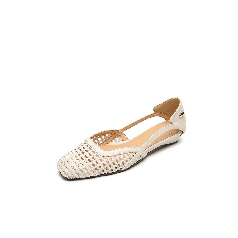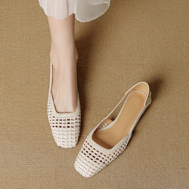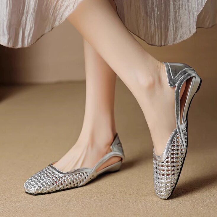 📚 2025夏新款绝美真皮编织镂空包头凉鞋女配裙子法式复古平底单鞋女