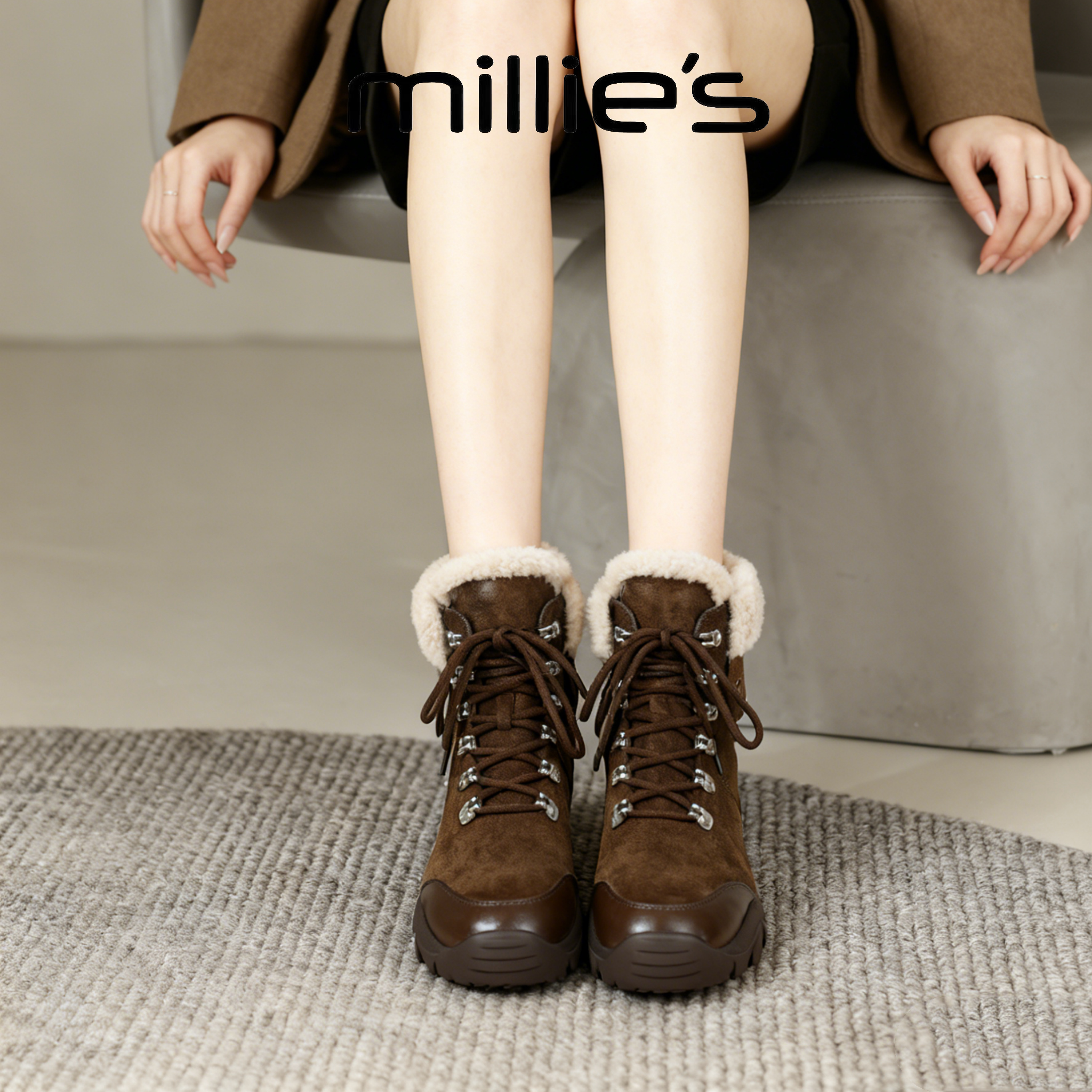 📚 MILLIE'S/妙丽毛毛鞋女冬季加绒保暖系带厚底防滑棉鞋外穿