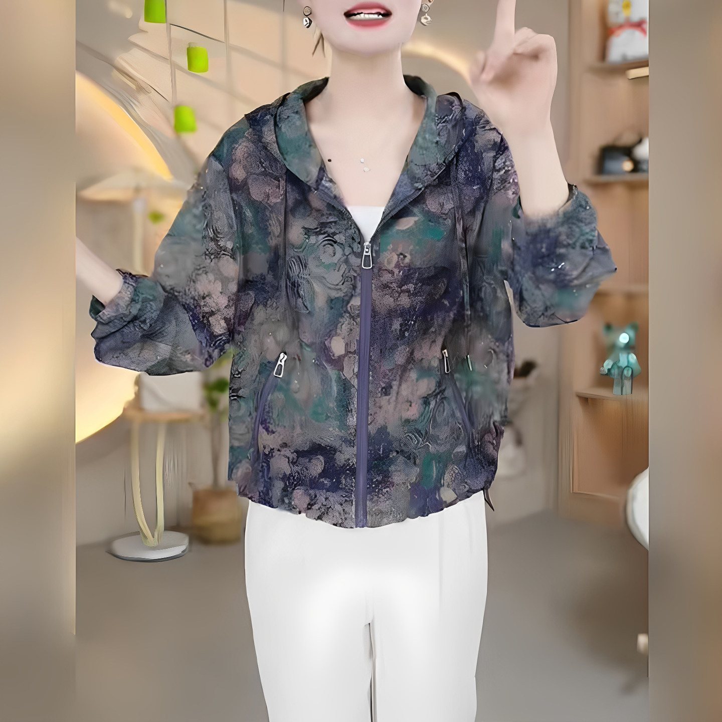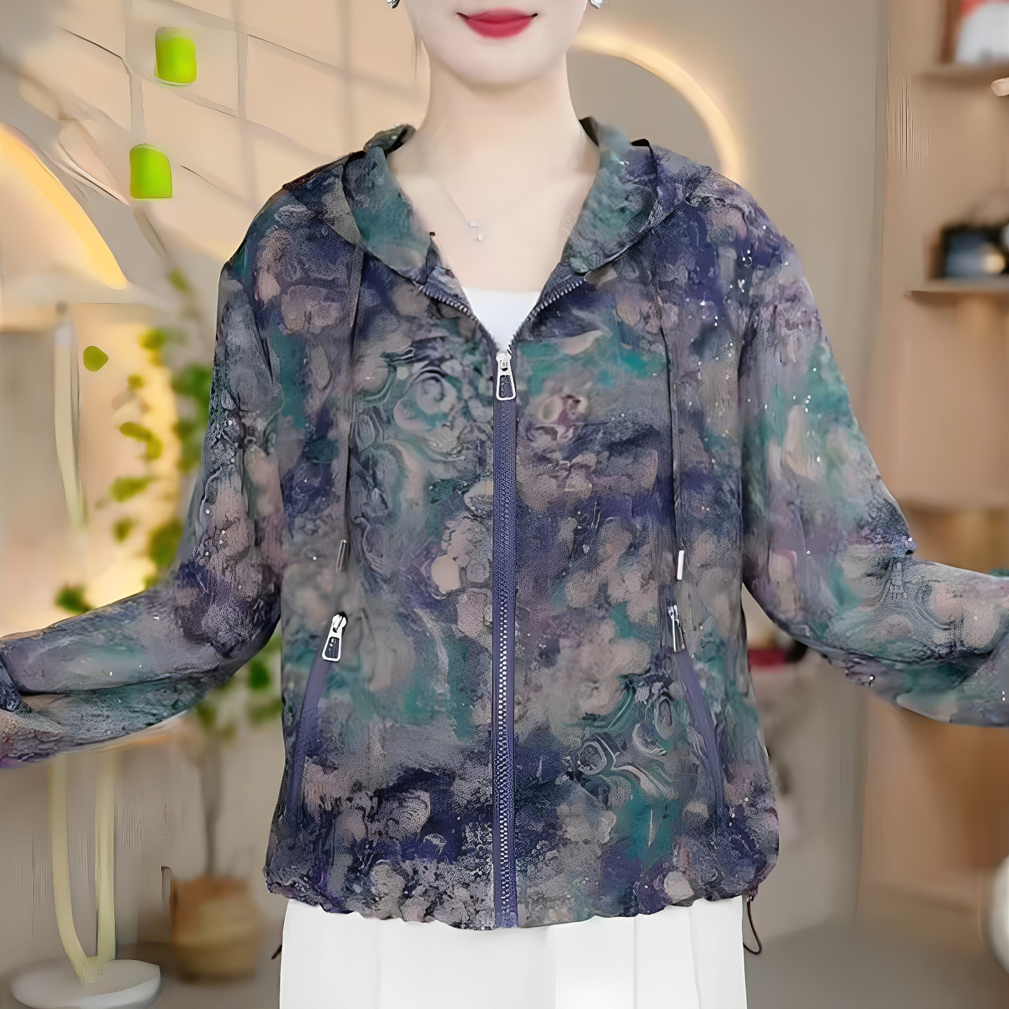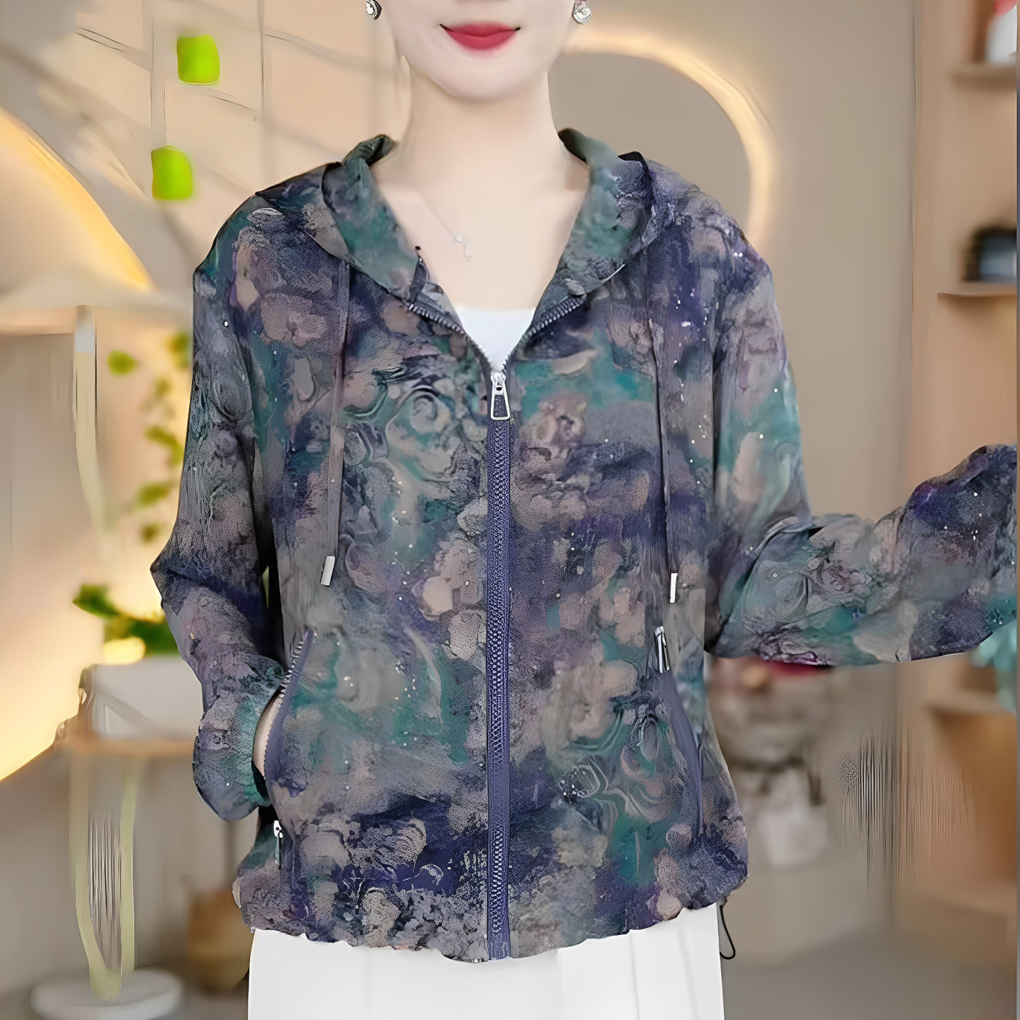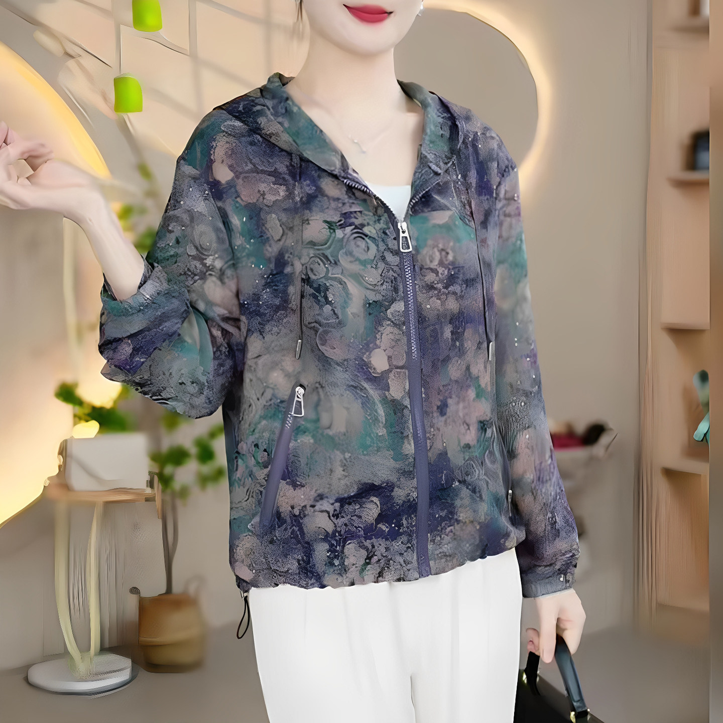 📚 妈妈装夏季连帽薄款印花长袖拉链衫宽松防晒服时尚女减龄休闲外套