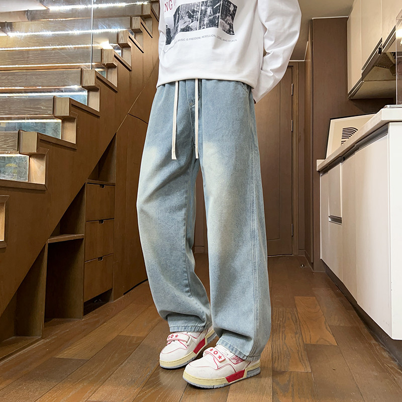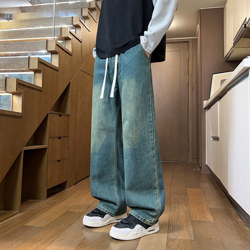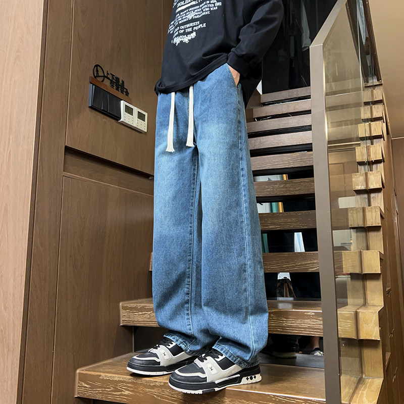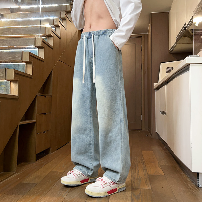 📚 牛仔裤男春秋季松紧腰宽松直筒裤新款大码潮牌高街复古休闲长裤子