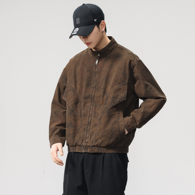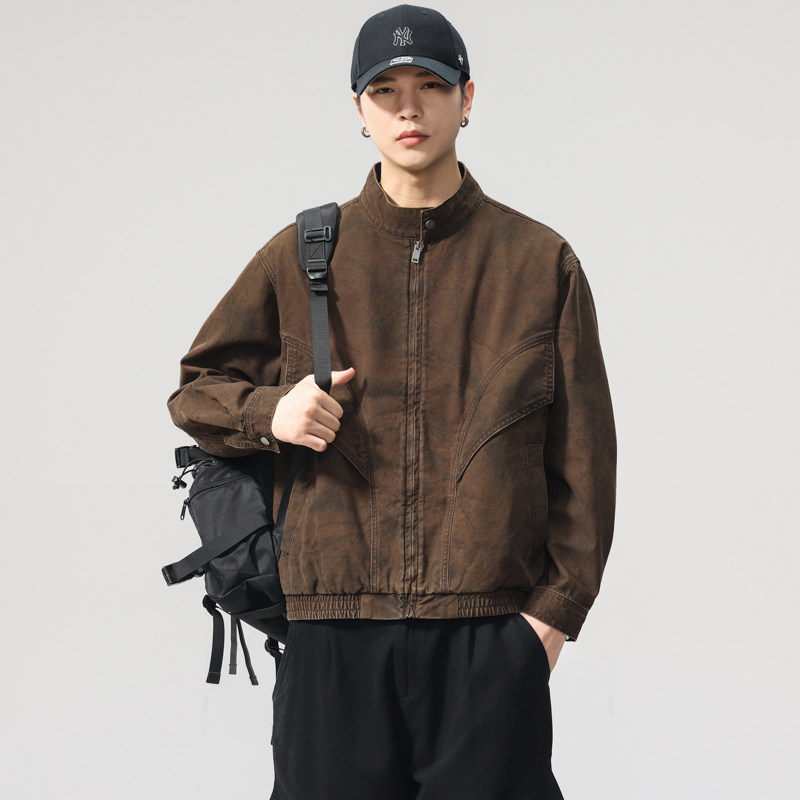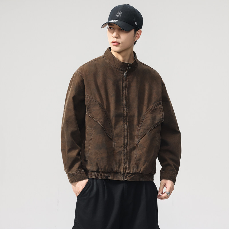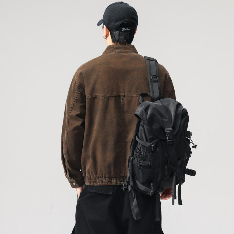 📚 美式复古巴恩风高密纯棉重磅机车立领夹克男2025秋季宽松工装外套