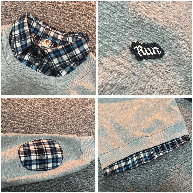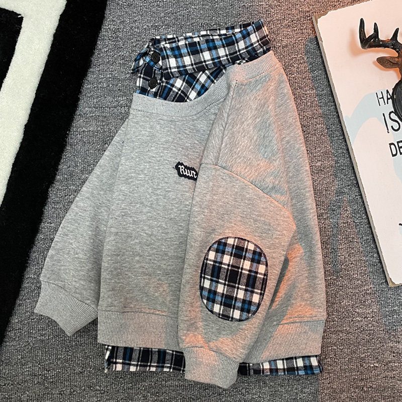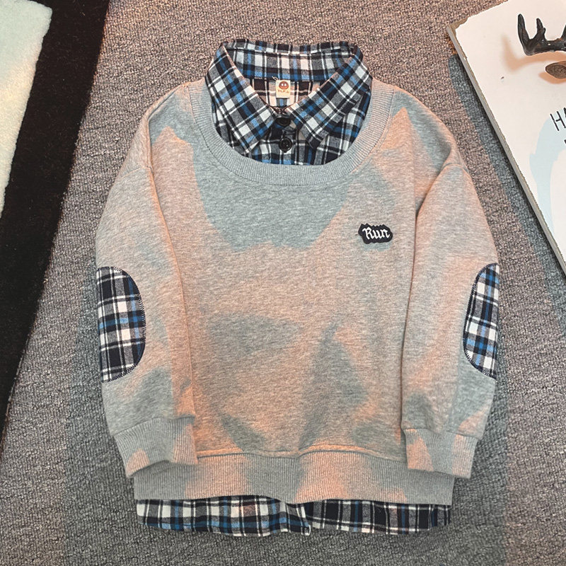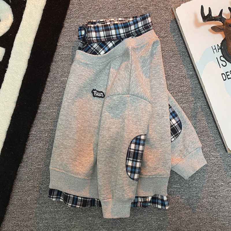 📚 2022新款男童假两件衬衫领卫衣秋冬季宽松格子拼接洋气加绒上衣潮